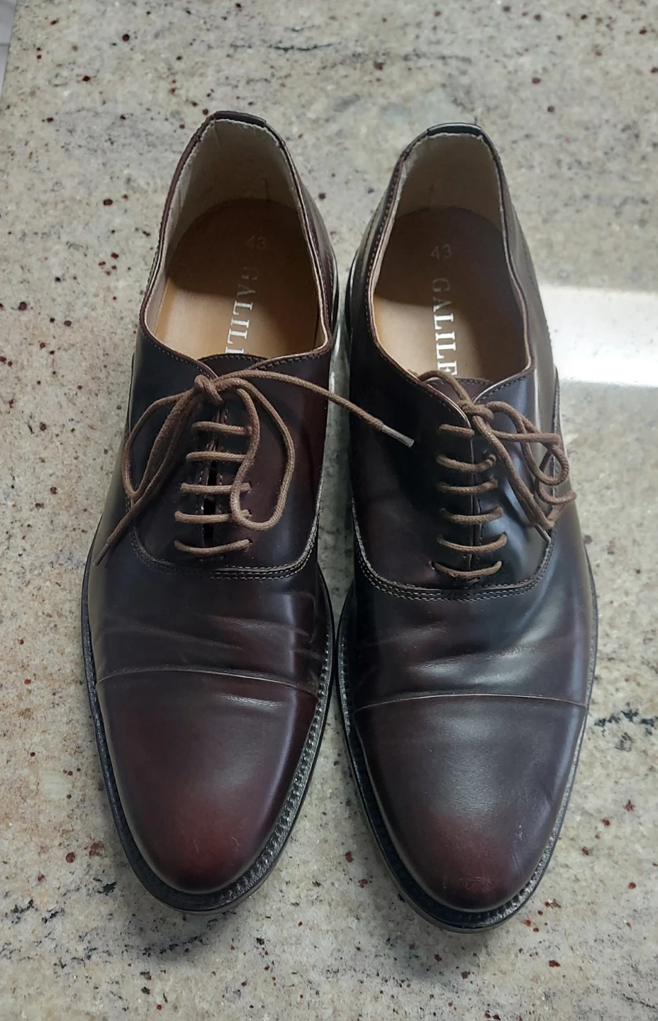 579Selling a pair of Galileo dress shoes in brown leather. They are size 43. Hand crafted design.