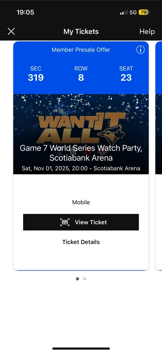 49Selling Eight ticket to the Game 7 World Series Watch Party at Scotiabank Arena. The event is on Saturday, November 1, 2025, at 8:00 PM. The seat is in Section 319, Row 8, Seat 23. $200 each 6 tickets available