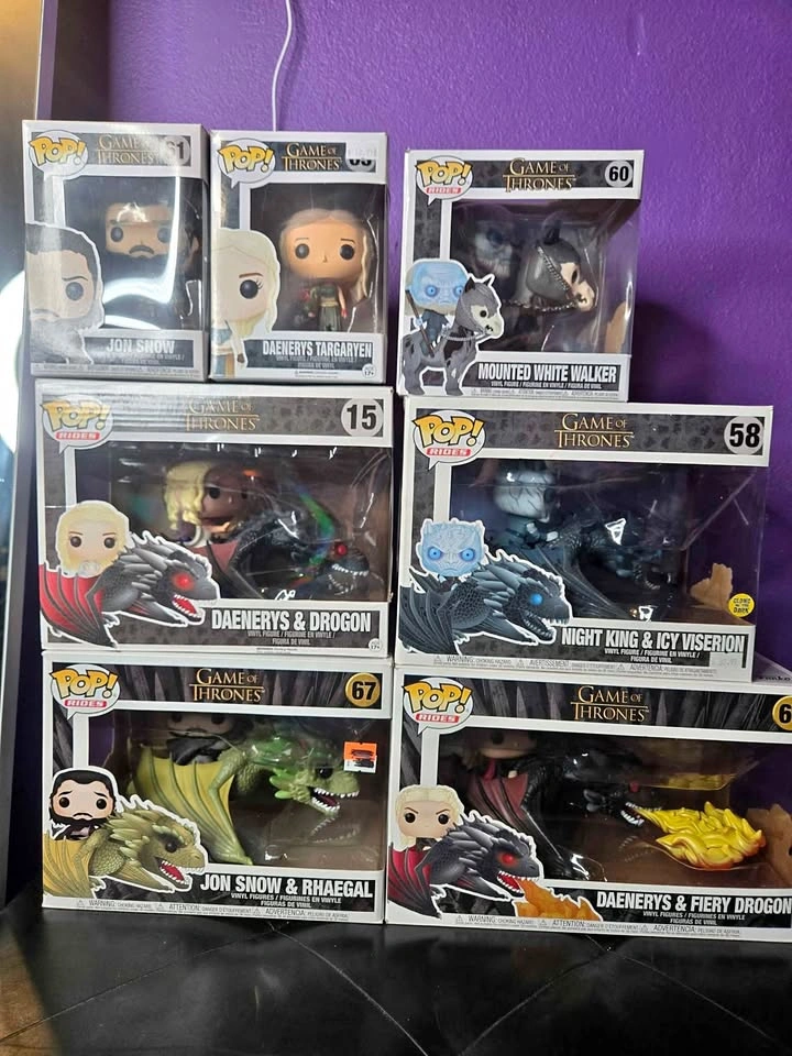 10Daenerys #03 $15 Jon snow #61 $20 Daenerys and drogon #15 $50 Jon snow and rhaegal #67 SOLD Mounted white walker #60 $20 Night king and icy Viserion #58 SOLD Daenerys and fiery drogon #68 SOLD Take all for $290