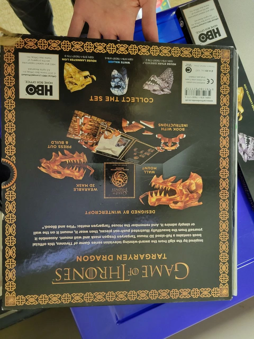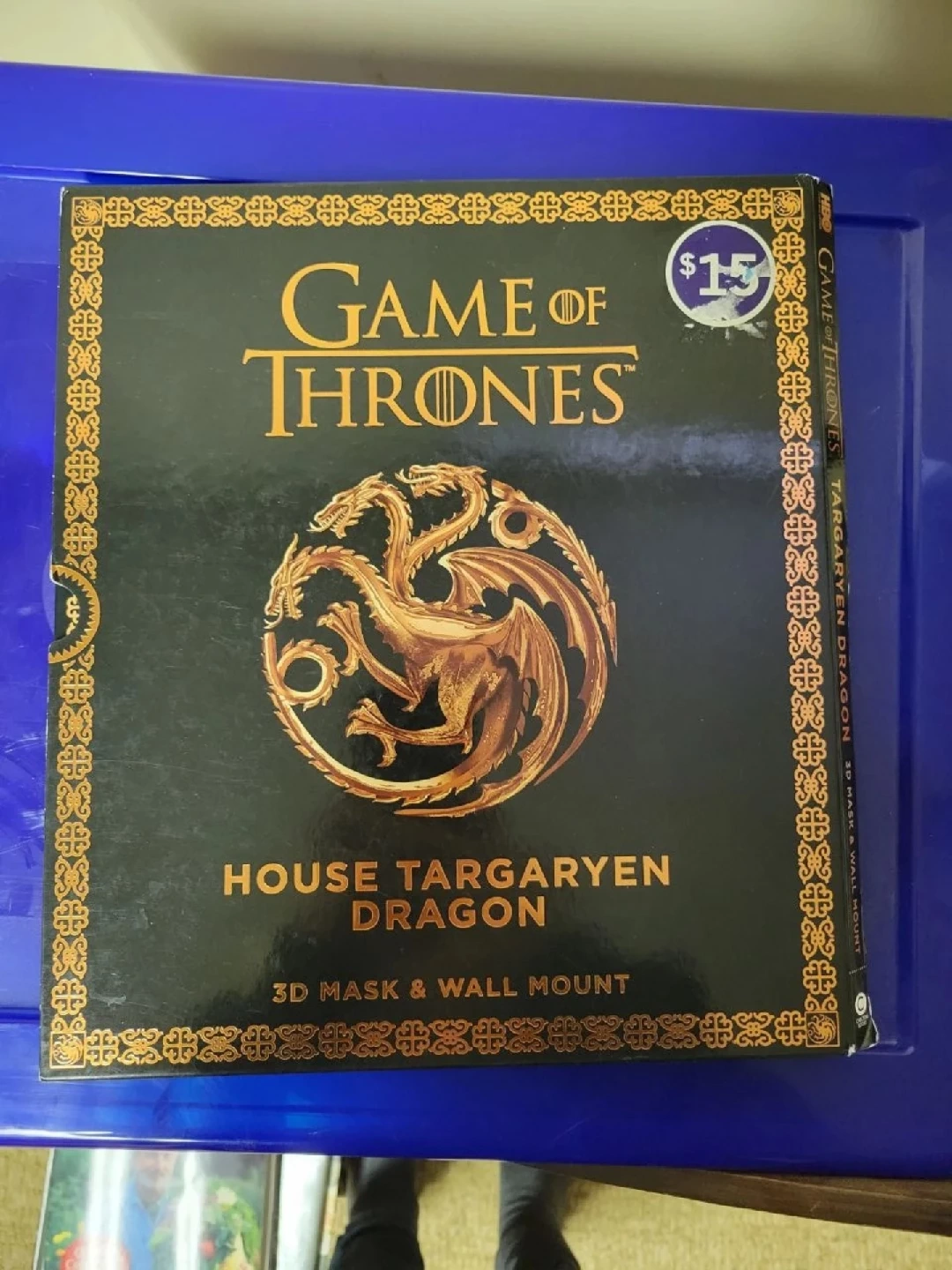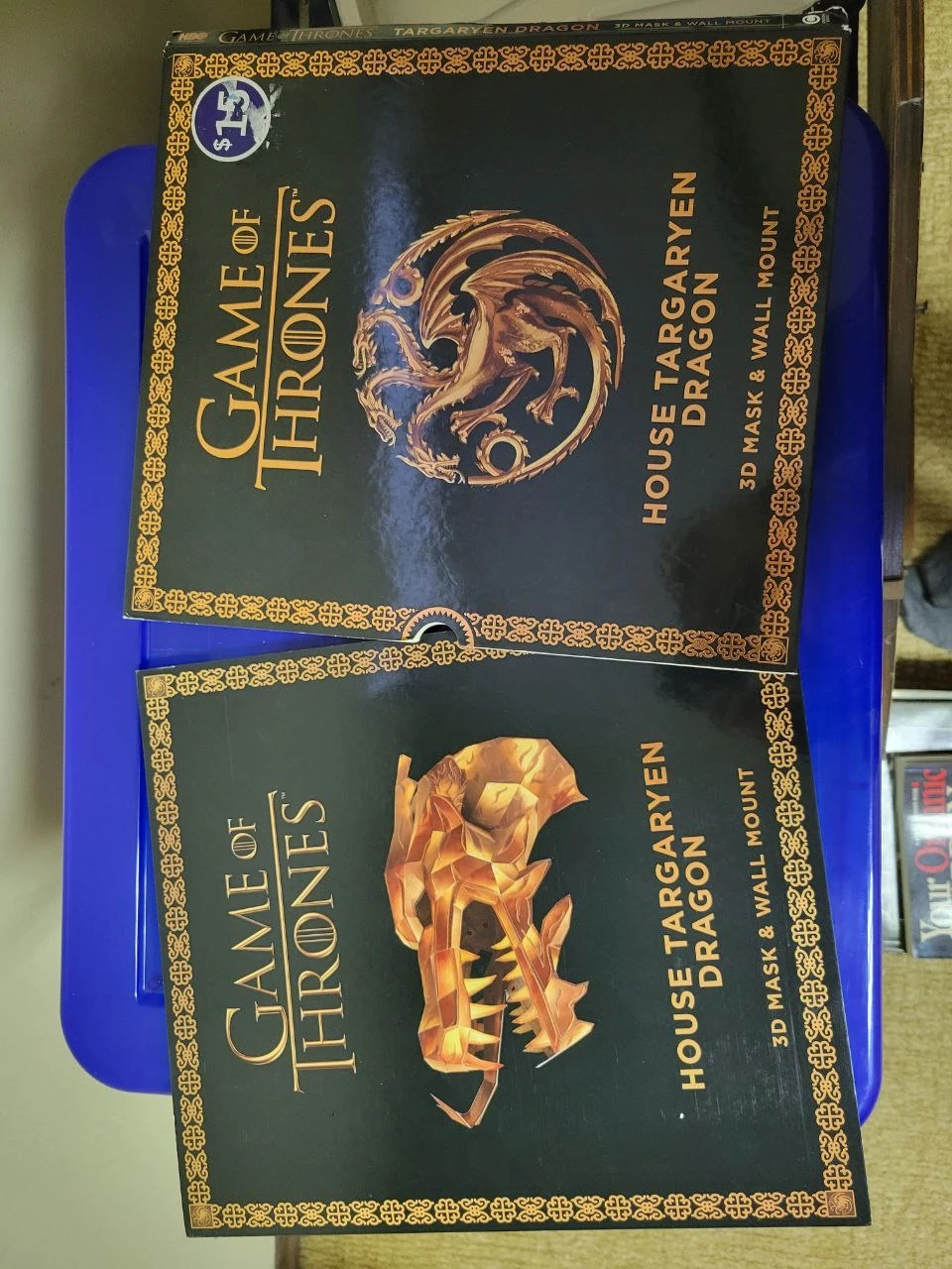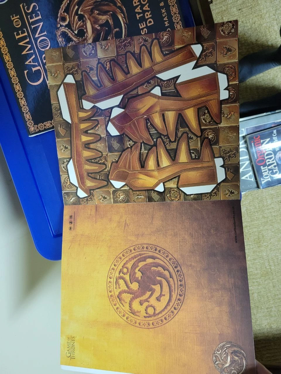 17New, never used Game of Thrones House Targaryen Dragon 3D Mask & Wall Mount Inspired by the sight from the award-winning television series Game of Thrones, this official book contains a full-sized 3D House Targaryen Dragon mask and wall mount. Assemble it by combining the beautifully illustrated push-out pieces, then wear it, mount it on the wall or simply admire it. And remember the House Targaryen motto, "Fire and Blood". Designed by Wintercroft