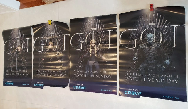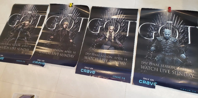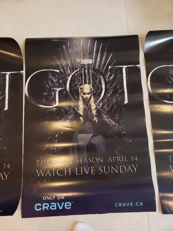 Game of Thrones season 8 TV Series 3 Posters Crave Tv: Jon Snow. Pick up at Vaughan Mills Mall. Dimensions: 36x 24 inches. Posters say: HBO GOT The final season April 1 Watch live Sunday Only on Crave Crave.ca