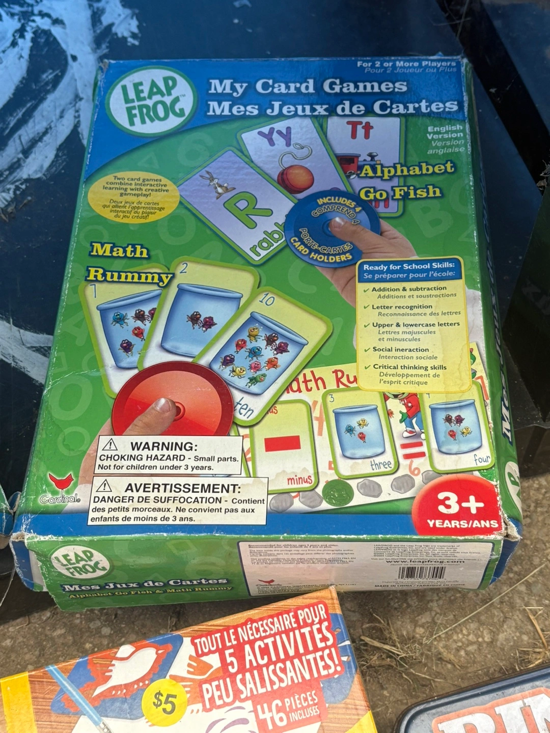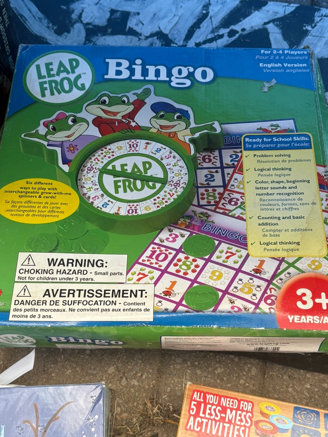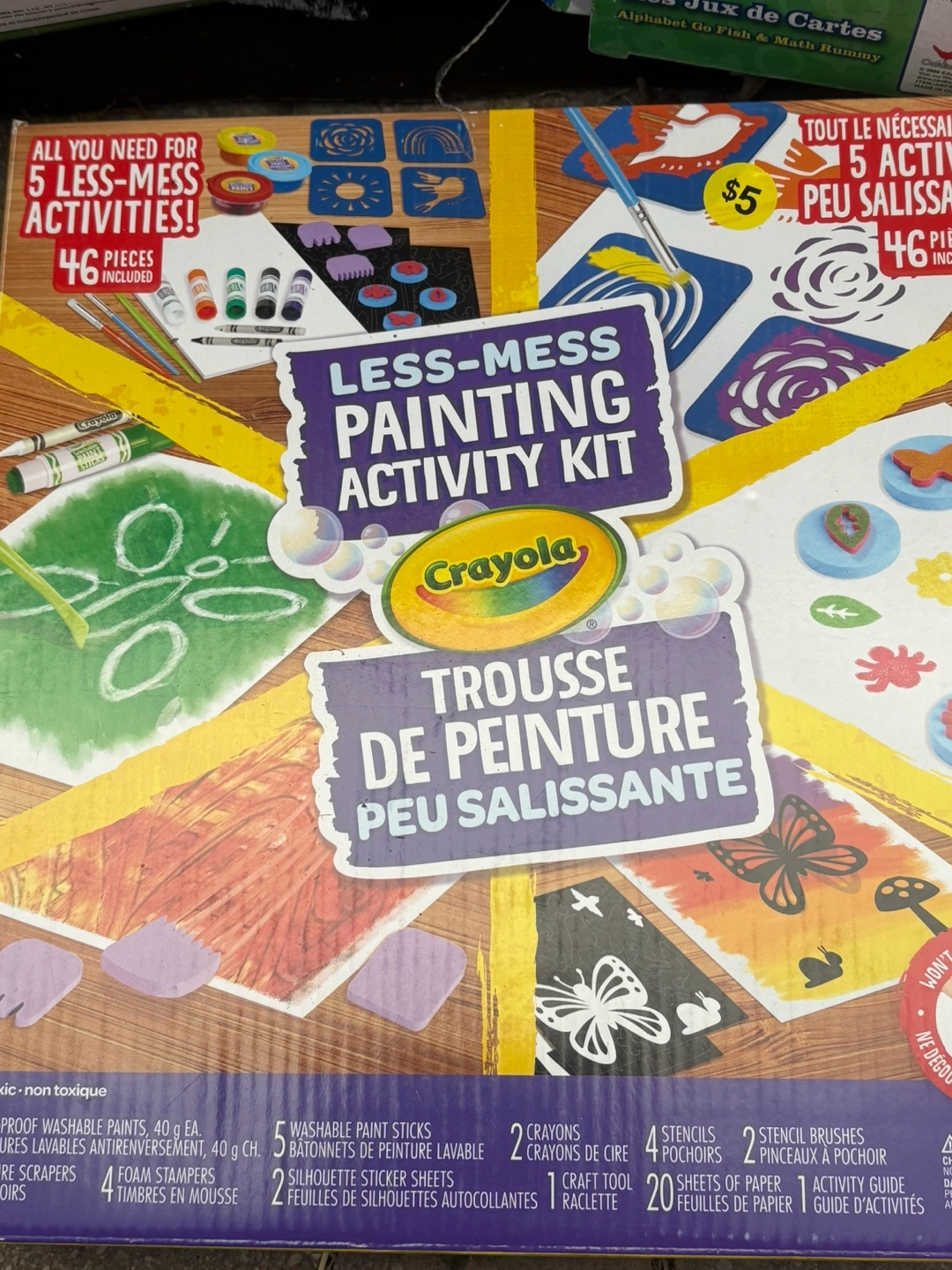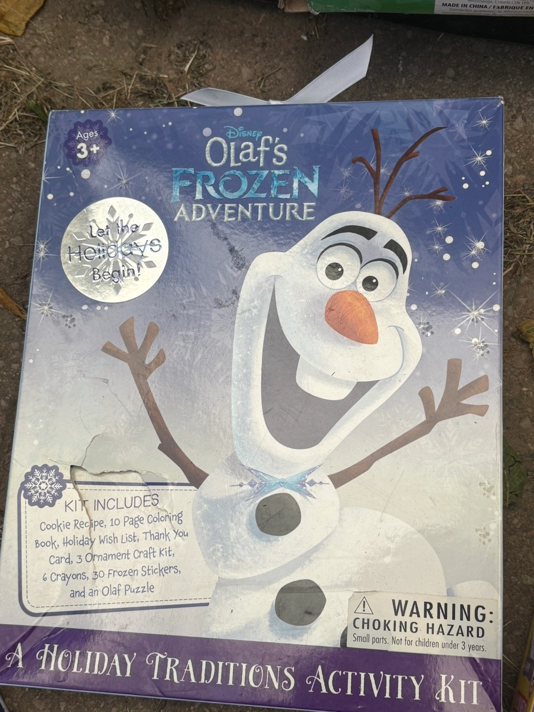 Selling a bundle of activity kits for kids! - Disney Olaf's Frozen Adventure Holiday Traditions Activity Kit includes a cookie recipe, colouring book, thank you card, ornament craft kit, stickers, and a puzzle - Leap Frog Bingo for 2-4 players, ages 3+ - Crayola Less-Mess Painting Activity Kit with 46 pieces $5 each