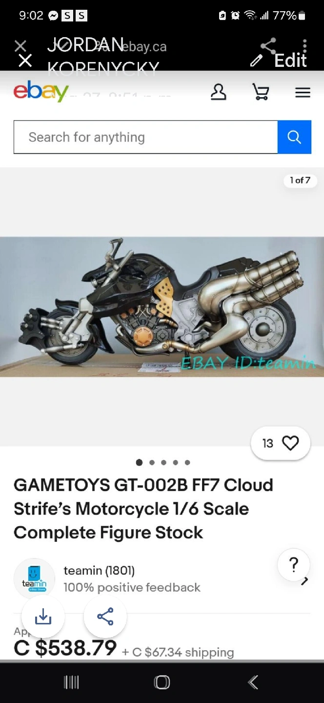 Selling a GAMETOYS GT-002B FF7 Cloud Strife's Motorcycle 1/6 Scale Complete Figure Stock. This is a great figure for any Final Fantasy VII fan!