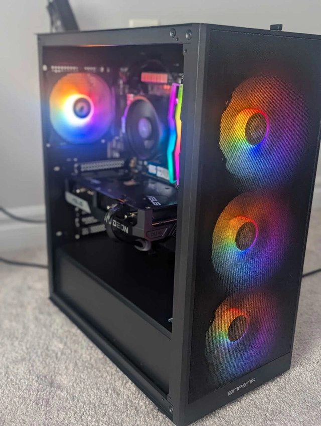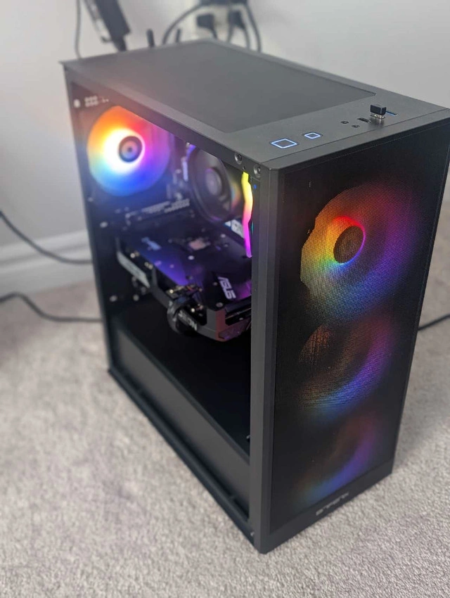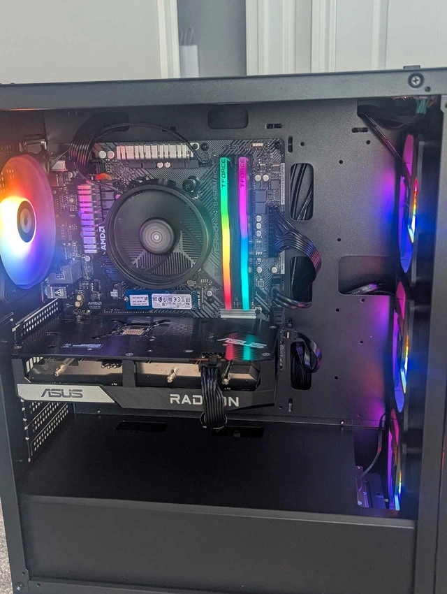 10This powerful mid-range gaming and streaming computer is built with reliable, brand-new components and is ready to deliver smooth 1080p and 1440p gaming performance. Featuring Ryzen multi-core power, a brand-new RX 6600 graphics card, and stylish ARGB lighting, this build combines performance with looks and amazing value. Specs: CPU: AMD Ryzen 5 3600 – 6 Cores, 12 Threads, excellent for gaming & multitasking GPU: Brand New ASUS Dual Radeon RX 6600 8GB – great for esports & AAA titles at high settings Motherboard: Brand New ASRock B450M/AC R2.0 – includes built-in WiFi and Bluetooth RAM: Brand New Team T-Force Delta RGB 16GB (2x8GB) DDR4-3600 ARGB – fast memory with customizable lighting Storage: Kioxia 240GB NVMe SSD (OS + applications) Toshiba 699GB HDD (extra storage for games & files) Case: Brand New BitFenix case with 4 RGB fans – excellent airflow & lighting Power Supply: Brand New Thermaltake 550W – reliable power delivery Performance Runs popular titles like Apex Legends, Fortnite, Valorant, and Call of Duty smoothly at high settings in 1080p and even 1440p. Great balance for both gaming and productivity. Condition: Majority of parts are brand new (GPU, motherboard, RAM, case, PSU).