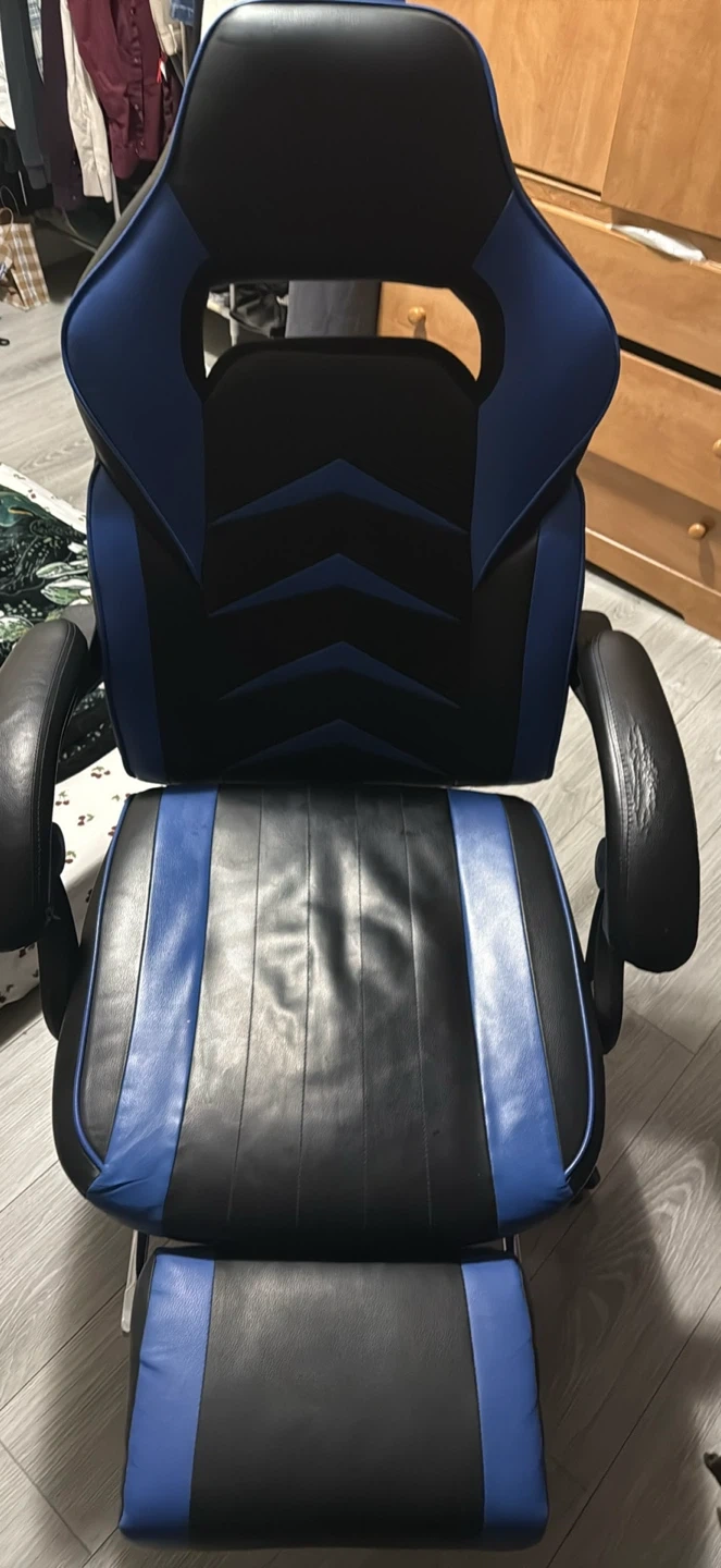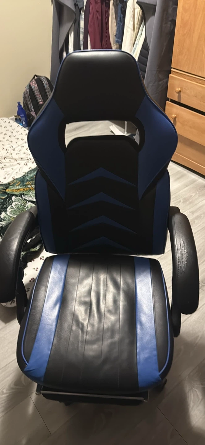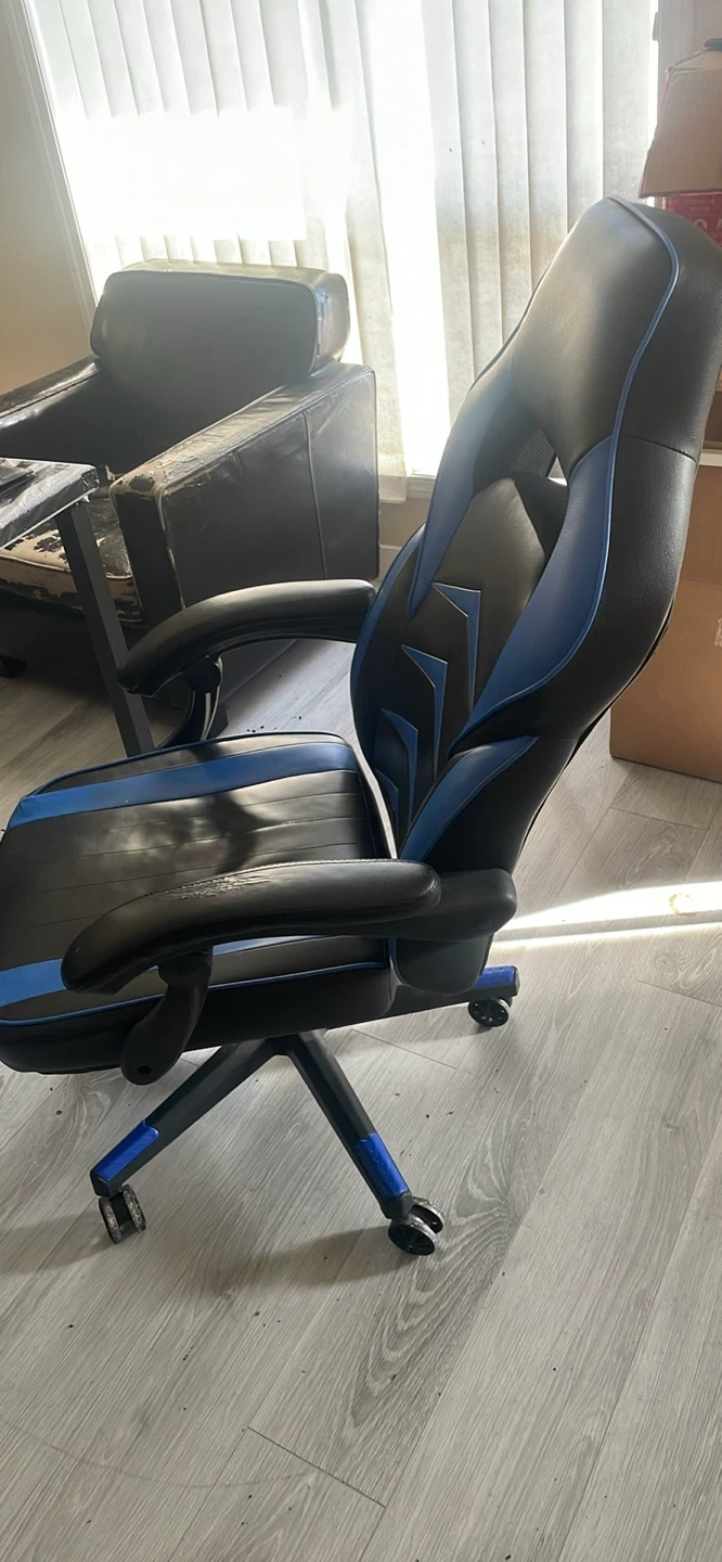 Selling a gaming chair in black and blue! It's in good condition Perfect for working from home and selling because going home permanently