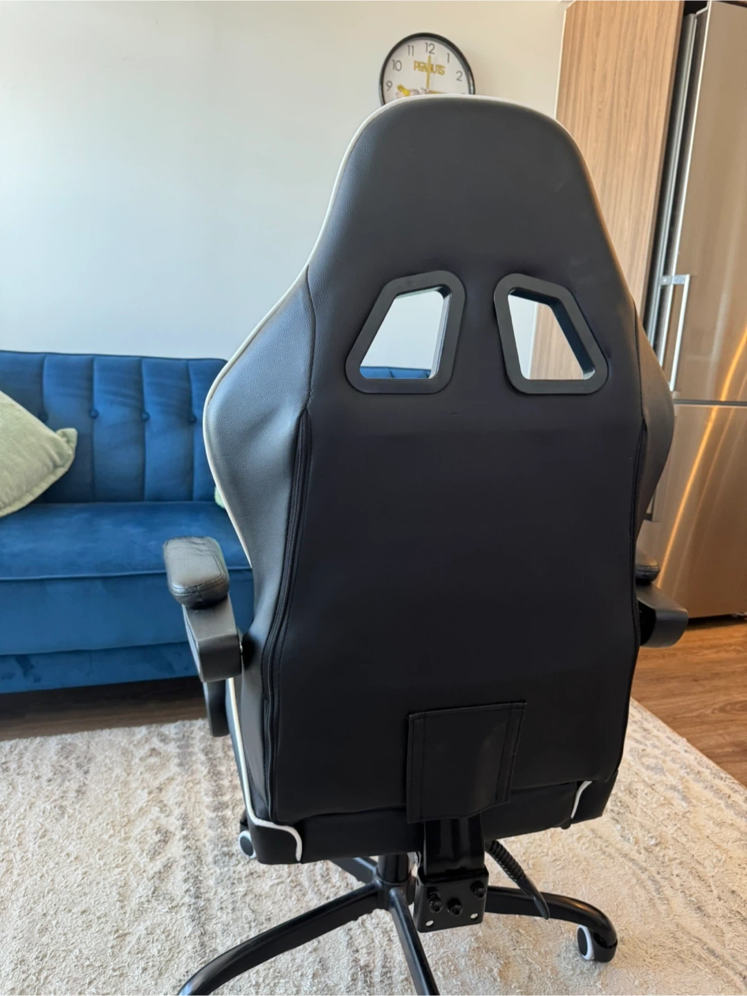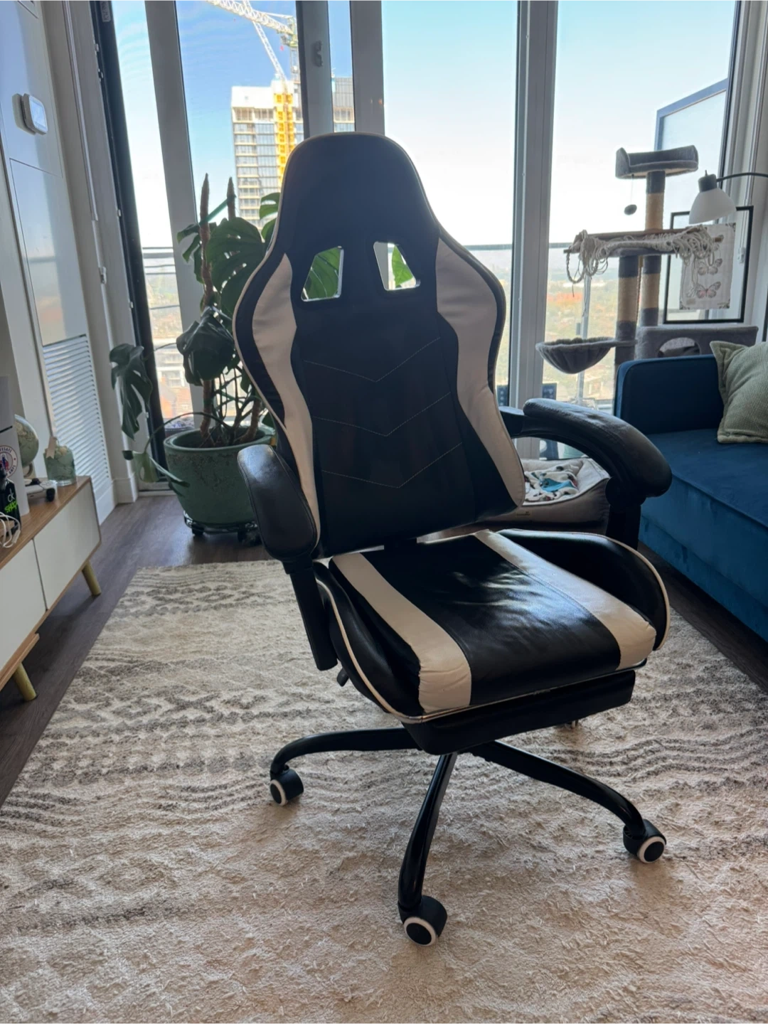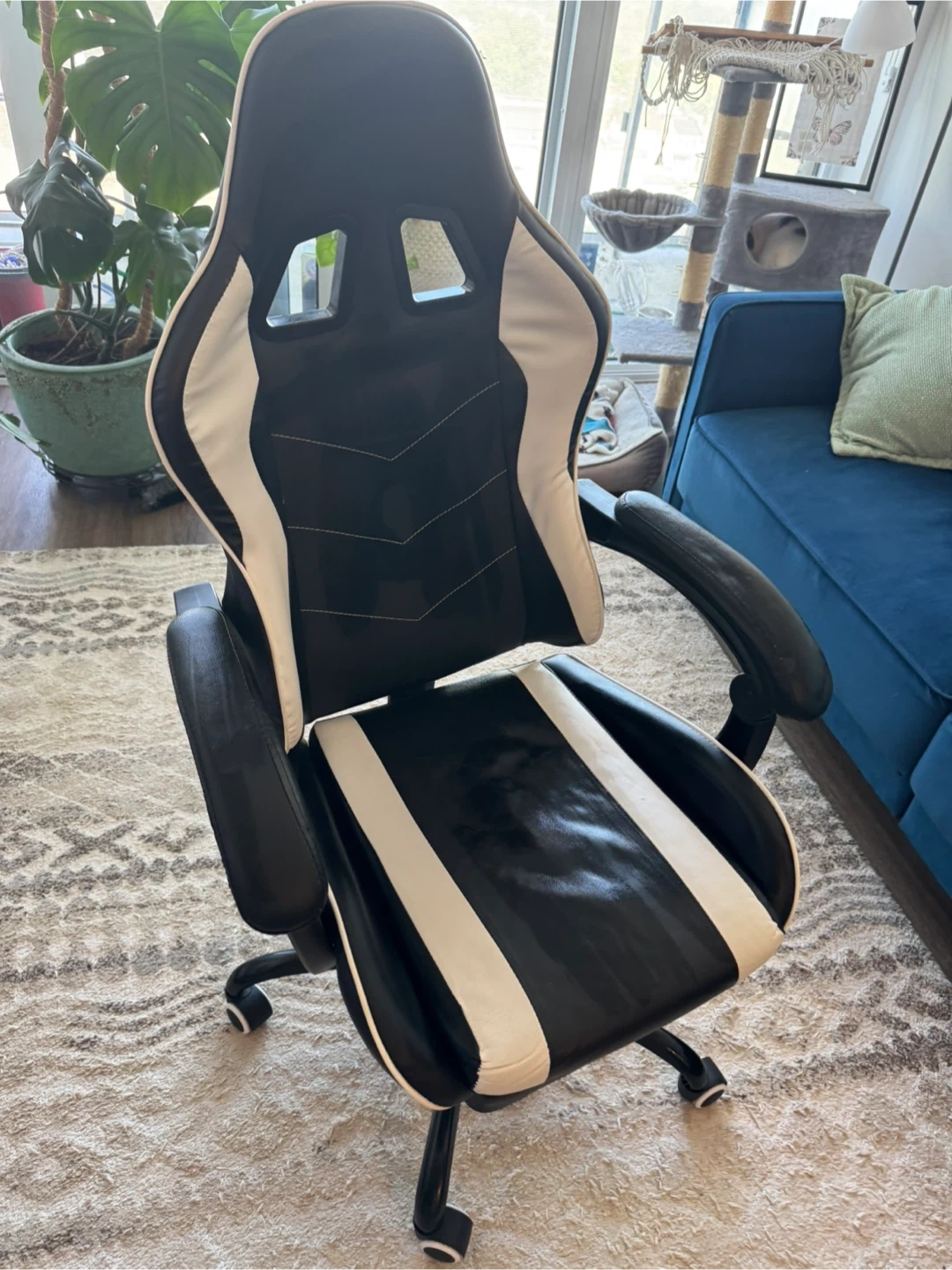 Selling a gaming chair in black and white. It's in good condition and ready for a new home! Perfect for long gaming sessions or working from home. The chair features a comfortable design with a high back and adjustable armrests.