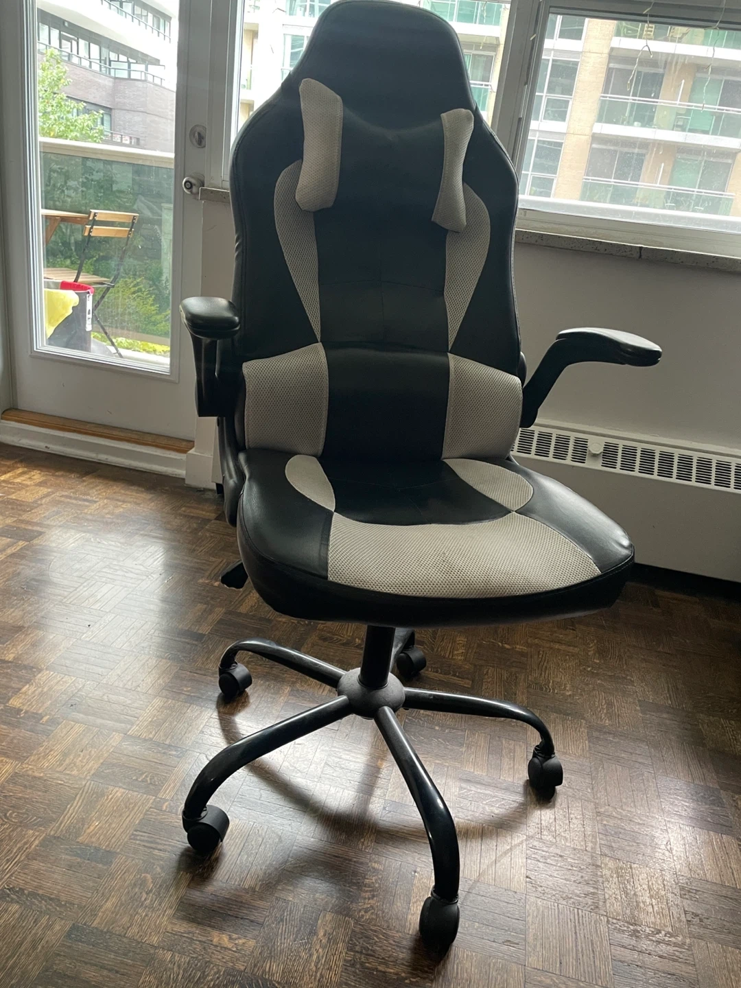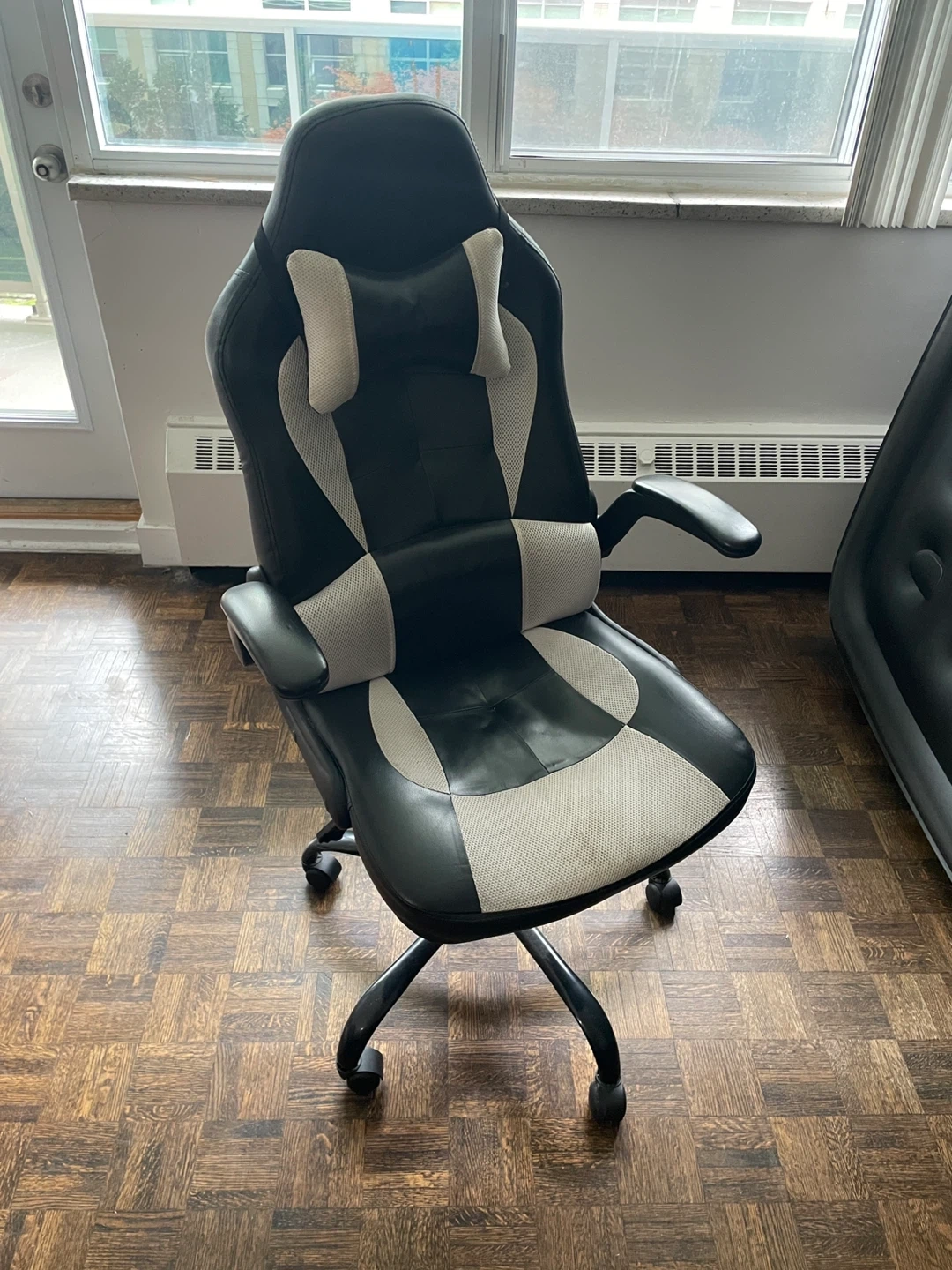 60Selling a gaming chair in black and white. It's in good condition and ready for a new home! Perfect for long gaming sessions or working from home. The chair has a comfortable design and provides good support.
