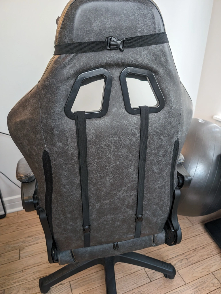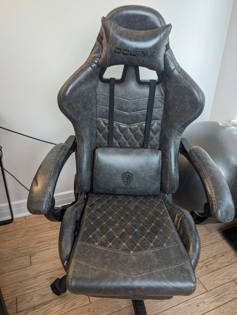 10High back chair with headrest and lumbar support. Has a built-in massager as well. Massage Lumbar Support, Adjustable height, Racing Style PU Leather High Back Adjustable Swivel Task Chair with Footrest Excellent for gaming and office use.