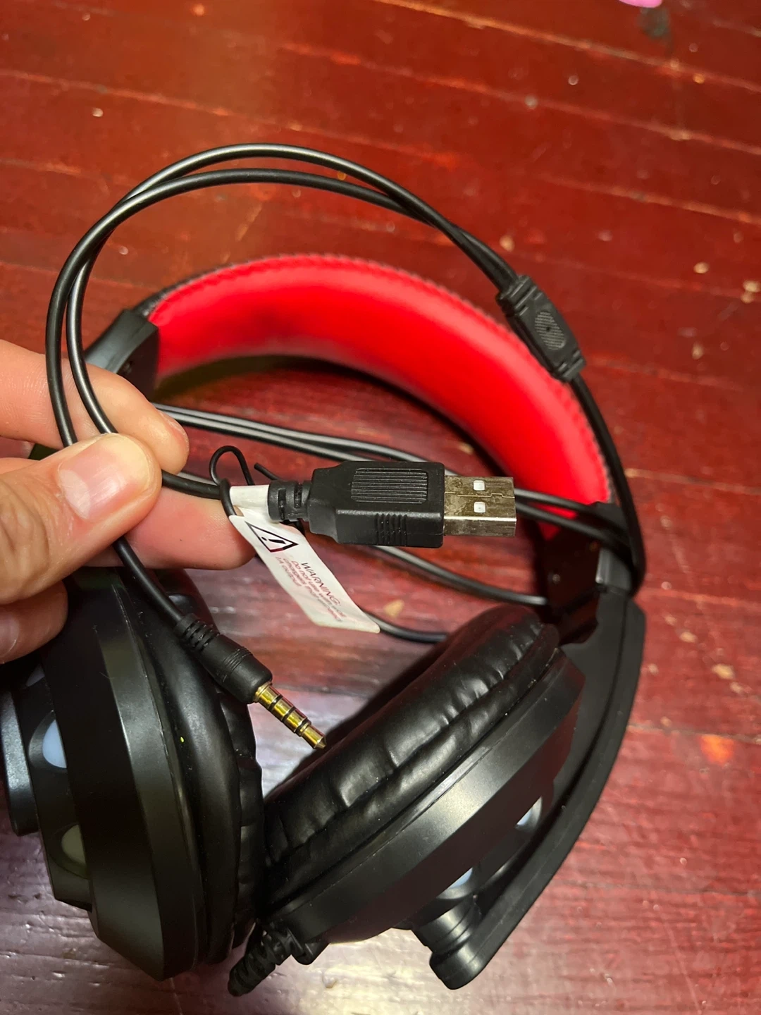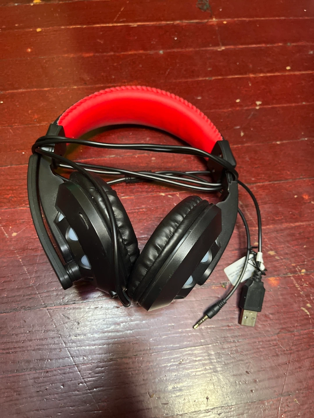 Selling a gaming headset in black and red. It features a padded headband for comfort and a USB connection. Perfect for gaming!