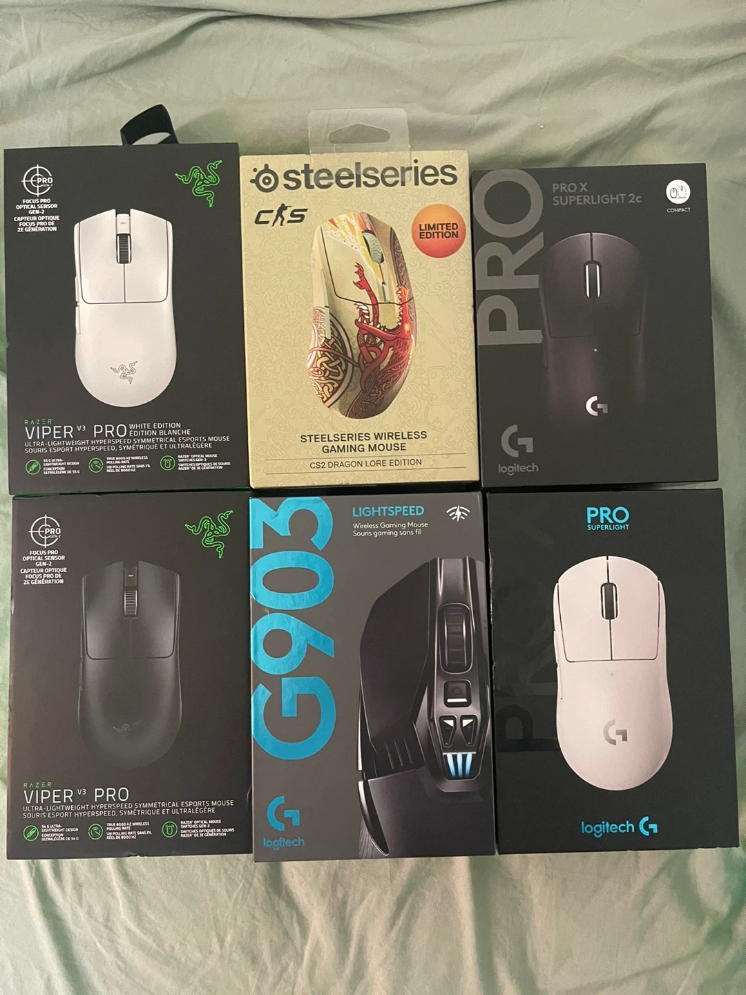 Selling a collection of gaming mice! All are brand new Includes: - Razer Viper V3 Pro: $150 - Steelseries CS2 Dragon Lore Edition Wireless Gaming Mouse (Limited Edition): $100 - Logitech PRO X Superlight 2c Compact: $160 - Logitech G903 Lightspeed Wireless Gaming Mouse: $120 - Logitech PRO Superlight: $130