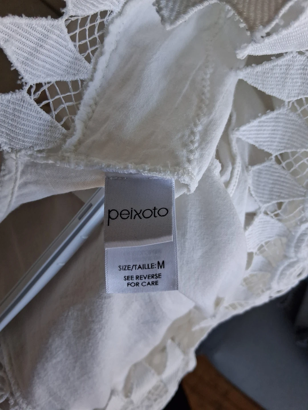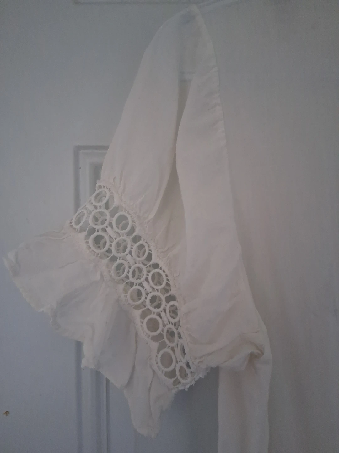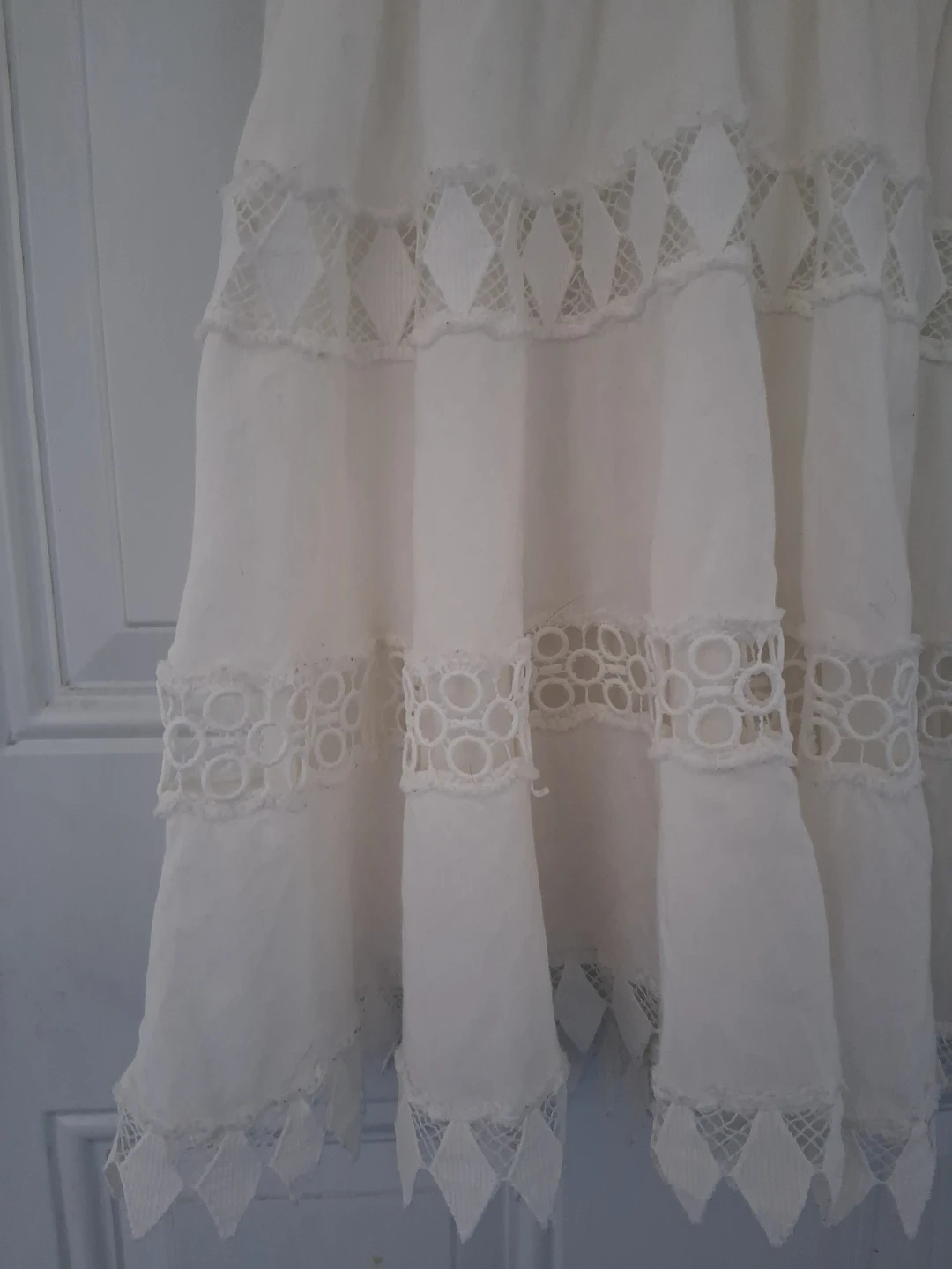 Pretty cream mini dress with delicate lace trim and eyelet details. Tiered skirt and gathered waist. Short puff sleeves with ruffled cuffs. Perfect for a summer day!