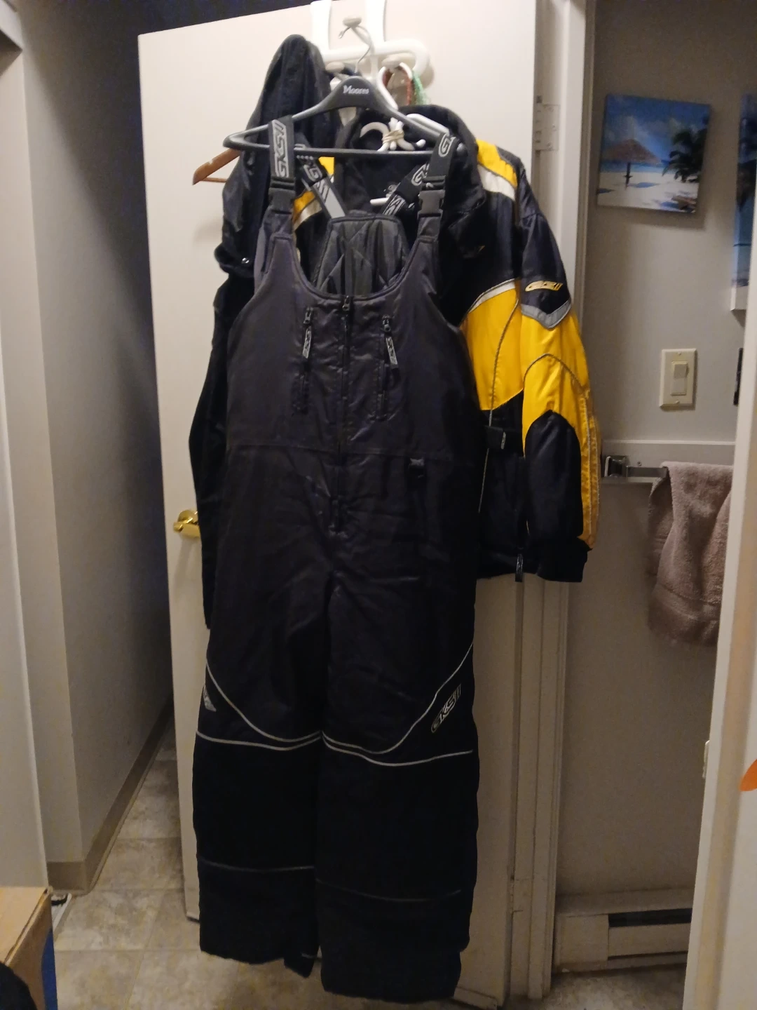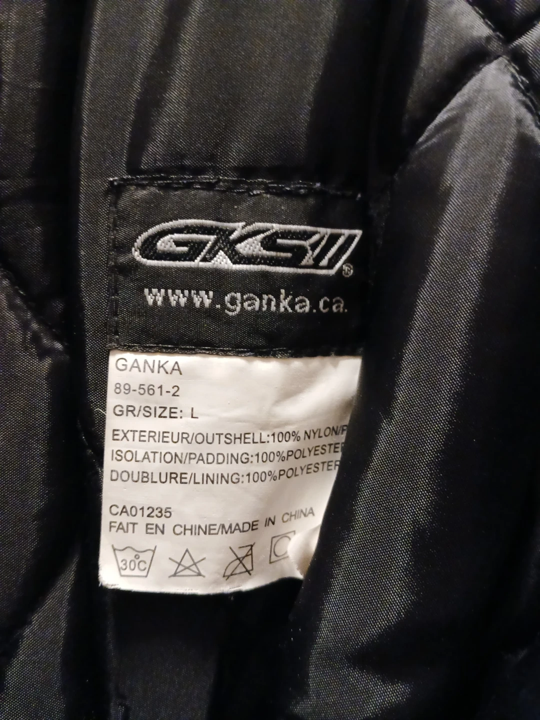 81Ganka snowmobile bib and jacket set in size L. The outershell is 100% nylon/polyester, and the lining is 100% polyester. Worn for 3 winters in the school yard( Sault Ste Marie, On) Has normal wear and tear. Very warm, don't need much layering of clothes underneath the snowstorm.