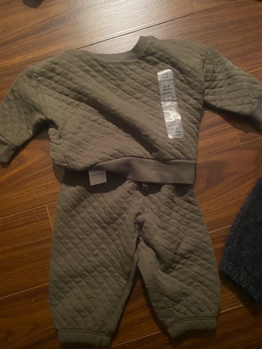Brand new with tags, this adorable quilted outfit is perfect for your little one! The set is sized for 3-6 months and features a comfy, quilted design in a stylish olive green colour