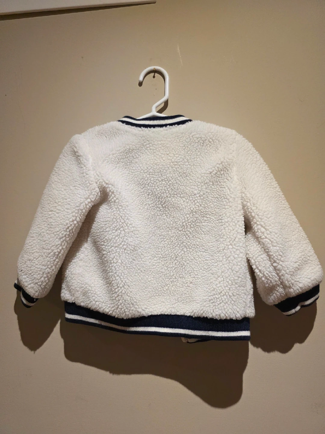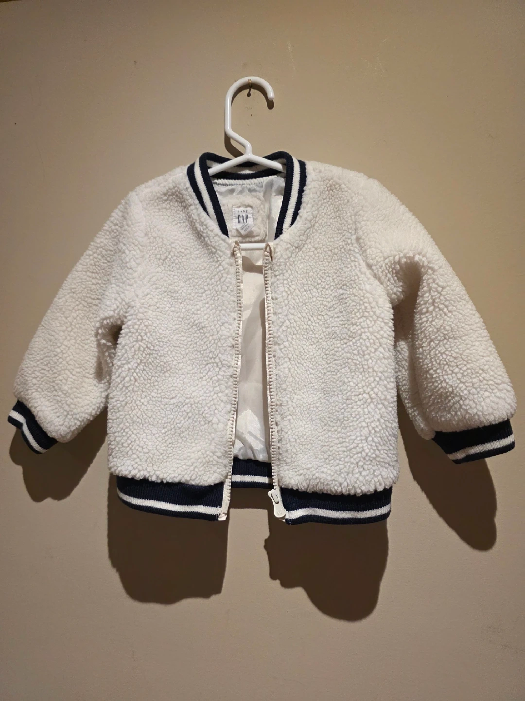 A cozy and stylish sherpa bomber jacket from GAP for your little one! It features a soft, textured sherpa material in white with navy blue and white striped trim on the collar, cuffs, and hem. Perfect for keeping your baby warm and fashionable