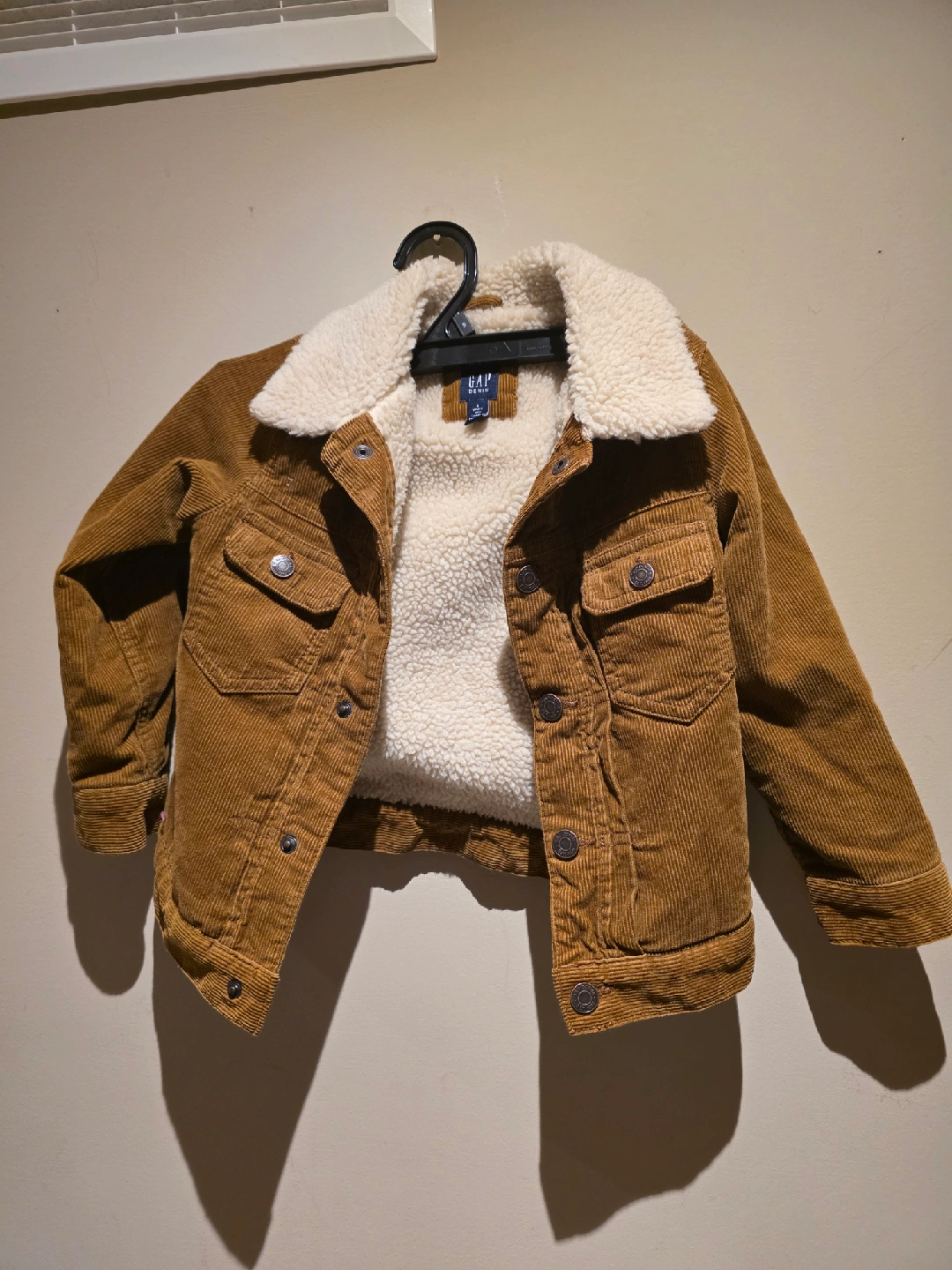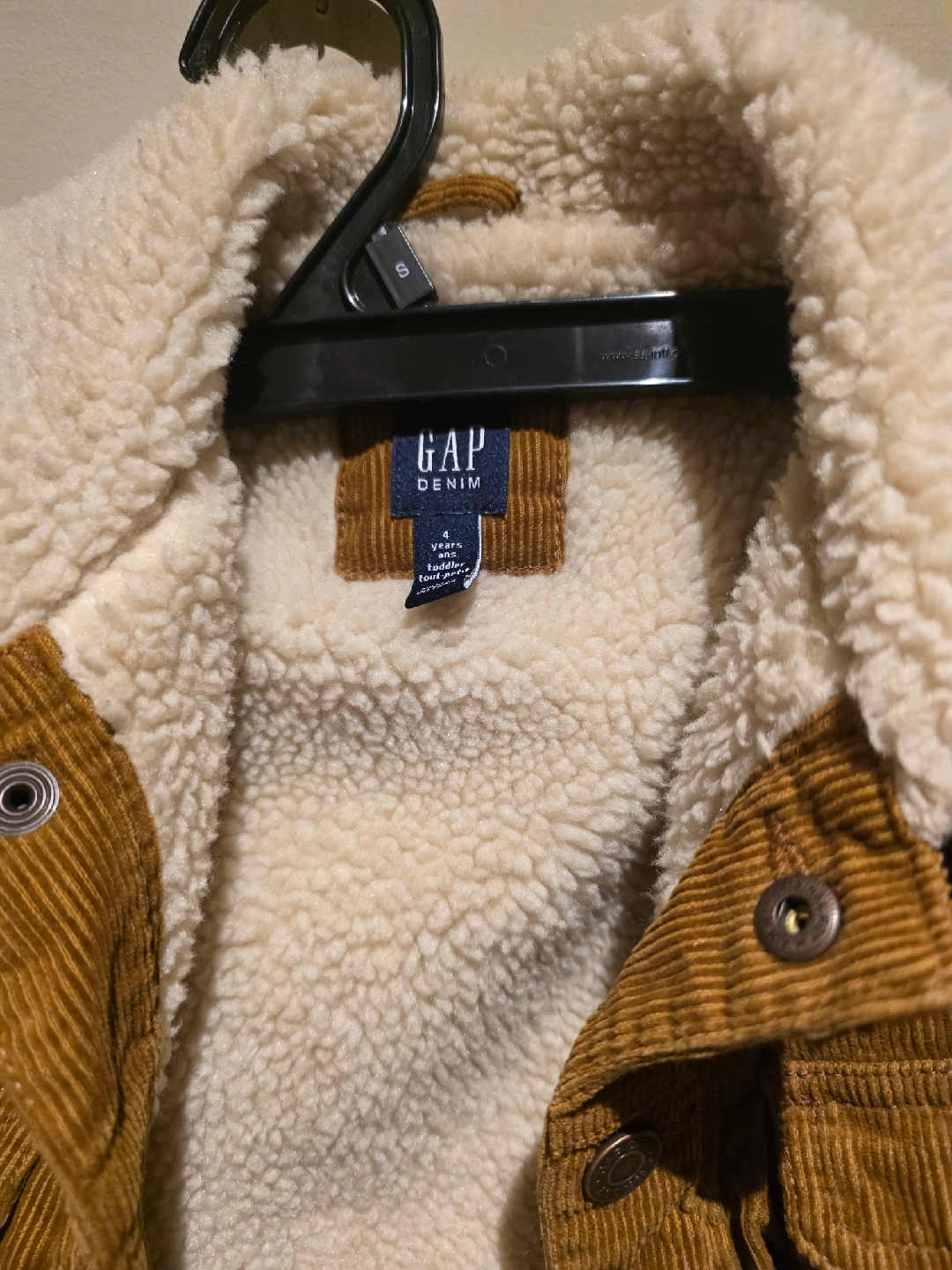 A cute and cozy GAP denim jacket for toddlers! The size is 4 years. It's in great condition and perfect for keeping your little one warm and stylish