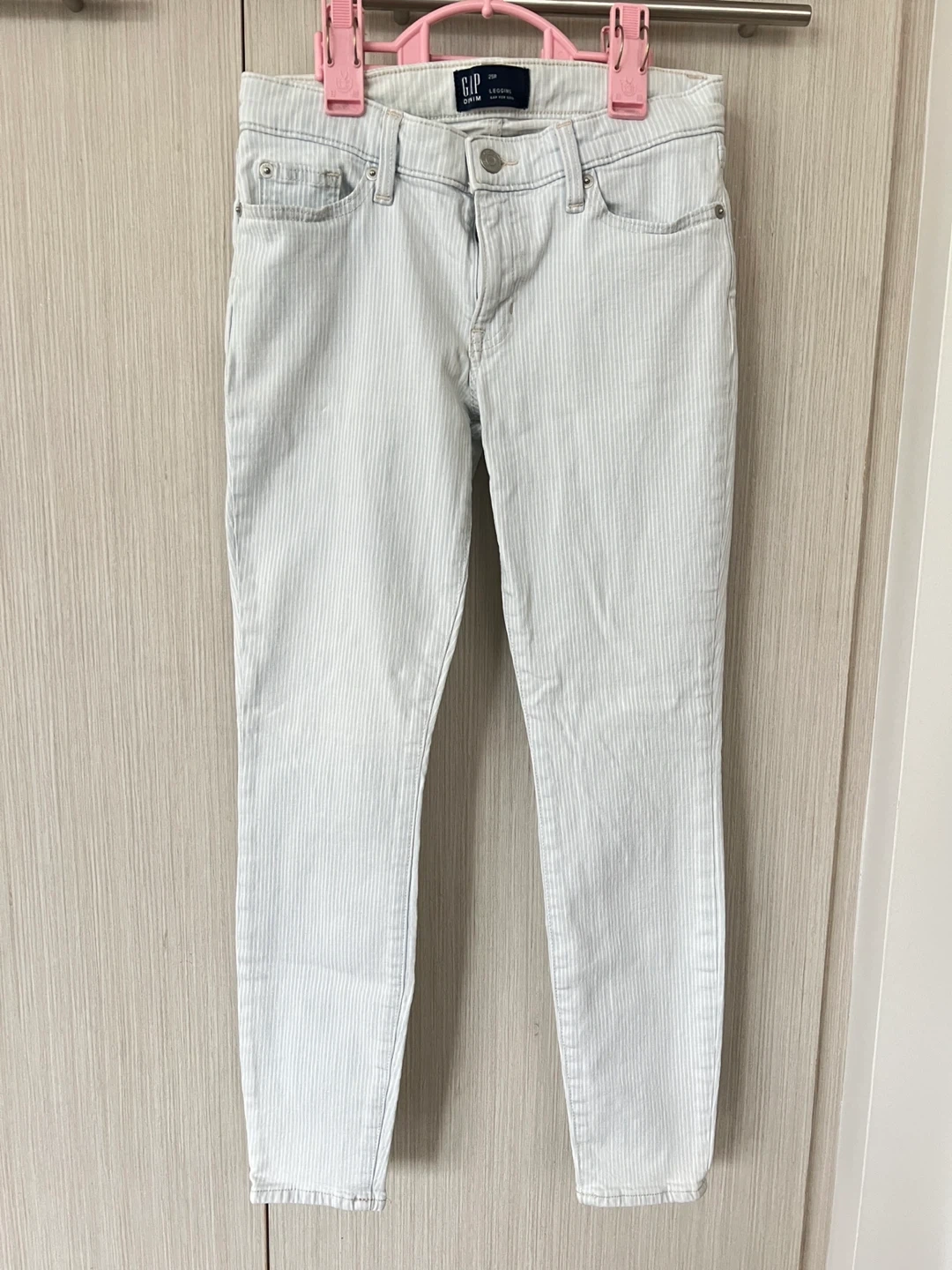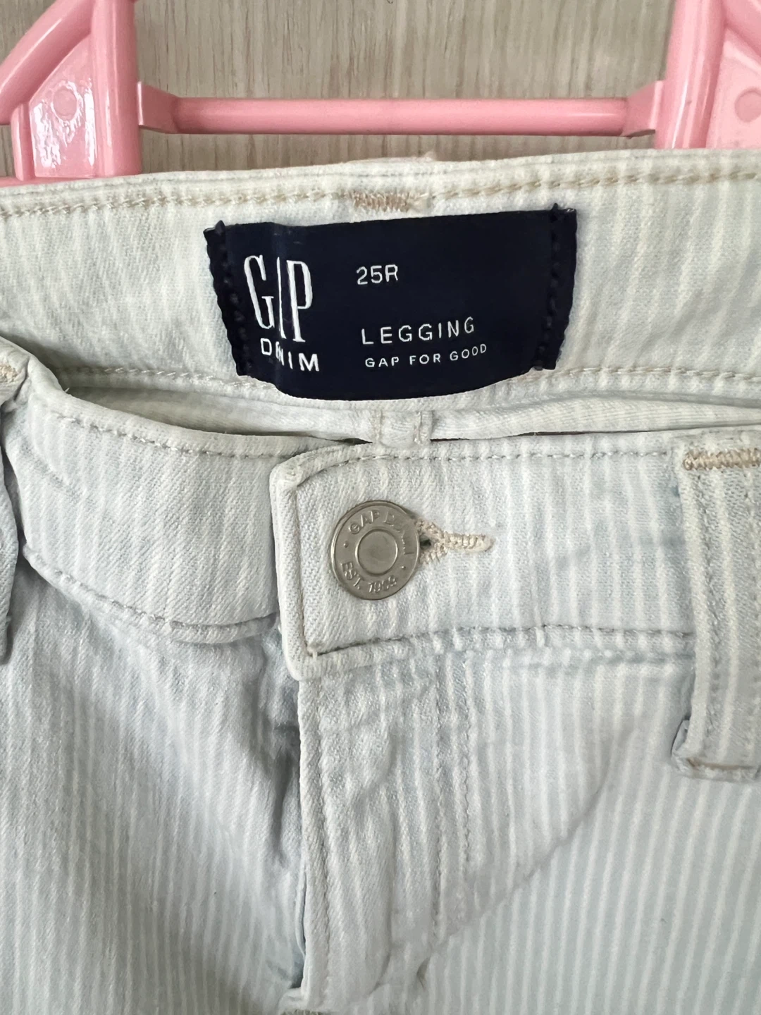 52Selling a pair of Gap Denim Leggings in size 25R! They're a light wash with subtle vertical stripes. Great for a casual look! pick up: 5033 Cambie St