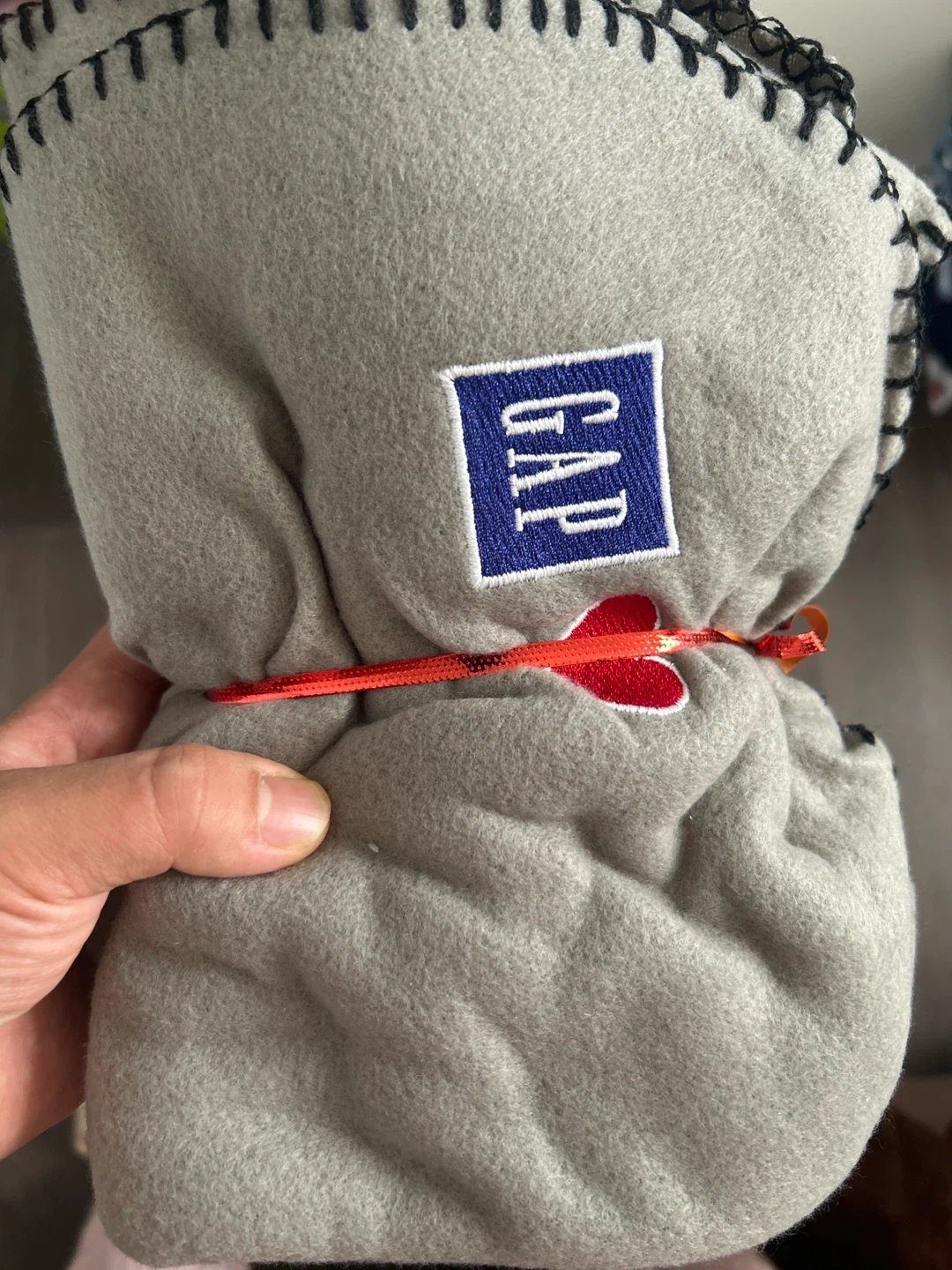 131Selling a cozy grey blanket from GAP! It's in great condition and perfect for snuggling up on the couch. The blanket has a cute design with black stitching around the edges and a little red heart detail. It's soft and warm, perfect for the cooler weather