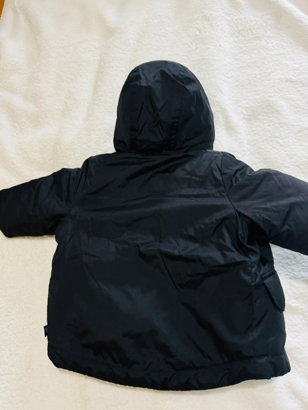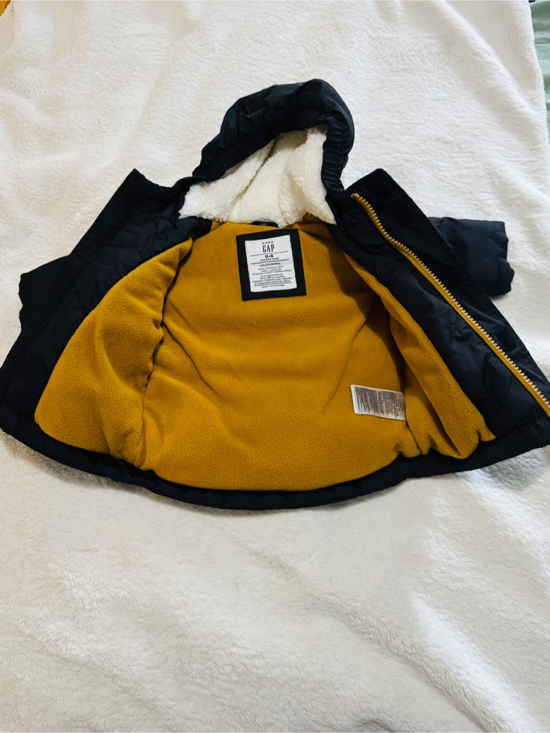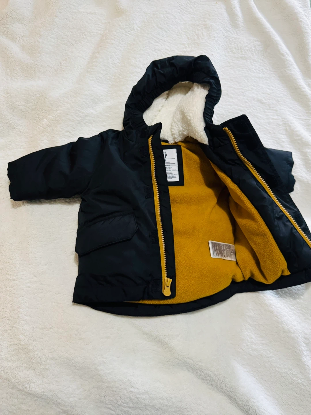 68A gently used GAP kids winter jacket in black. It has a cozy sherpa-lined hood and a warm yellow fleece lining inside. Perfect for keeping your little one snug during the colder months!