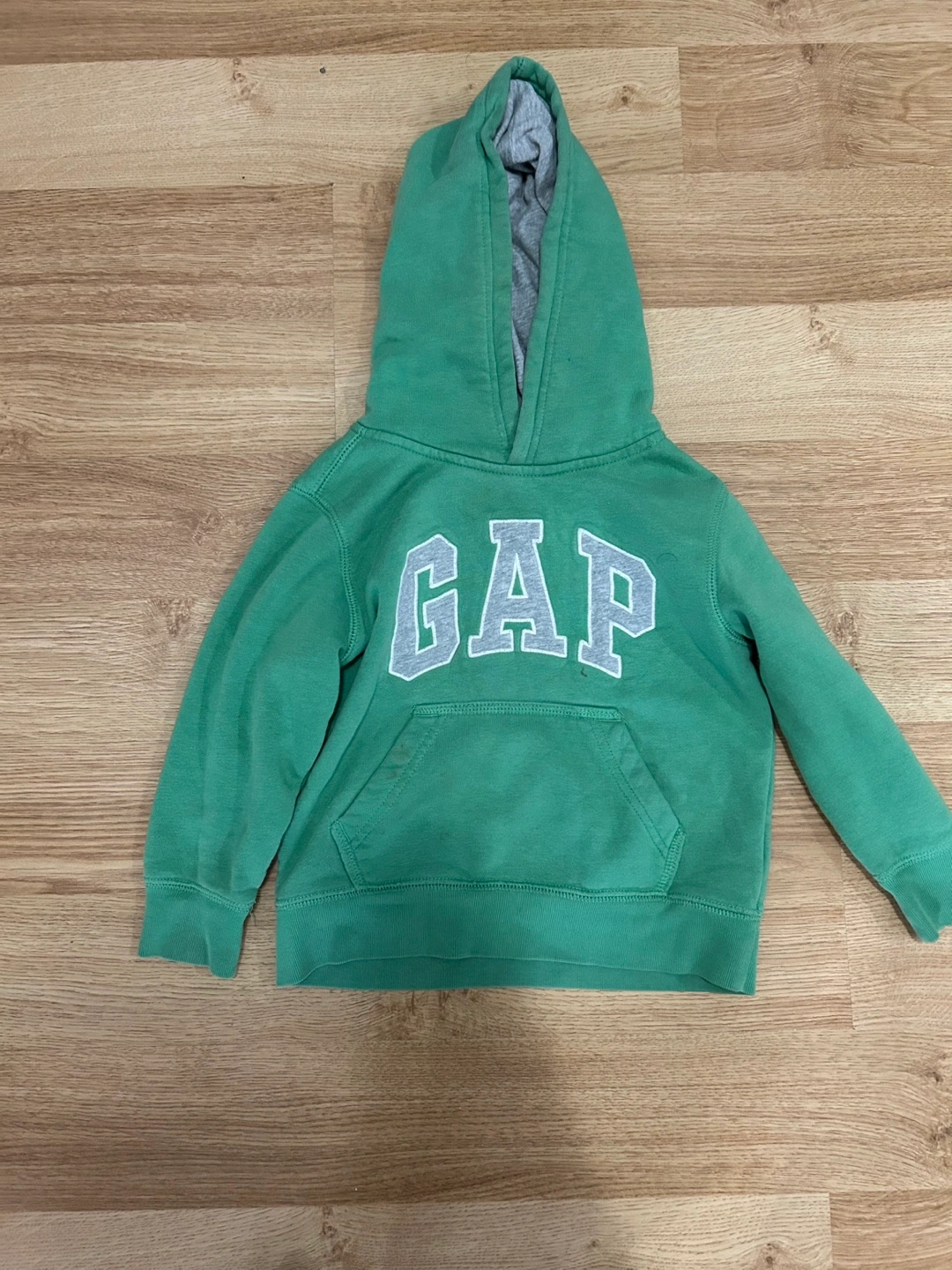 65Green children's hoodie. Features a large GAP logo on the front. Long sleeves and a kangaroo pocket.