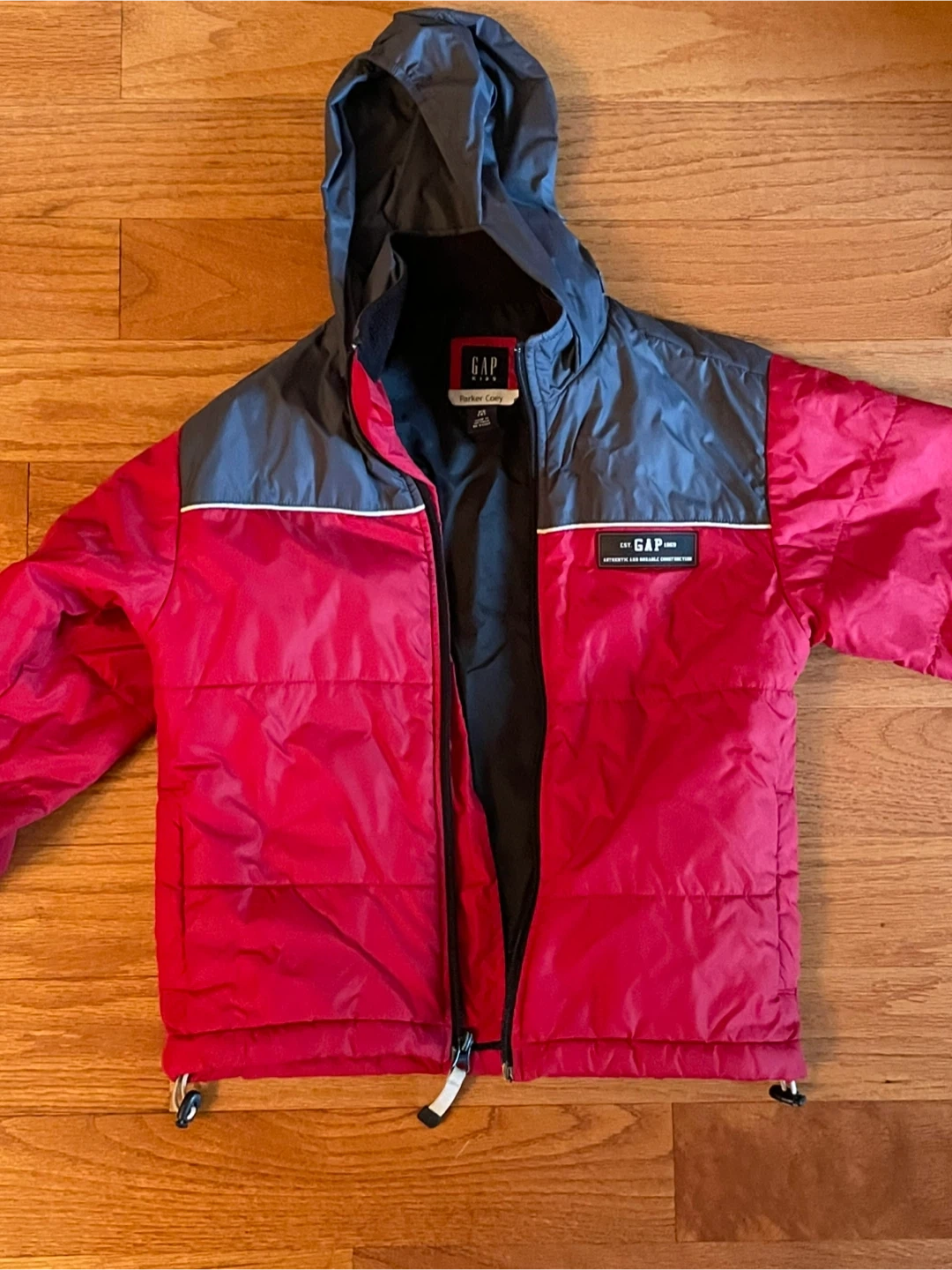 Here's a cute GAP Kids puffer jacket! It's a size XS (4) and features a stylish colour-blocked design in red and grey. Great condition. Hardly used.