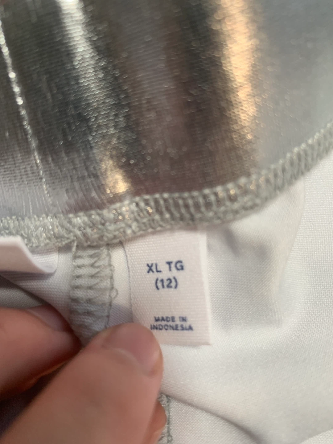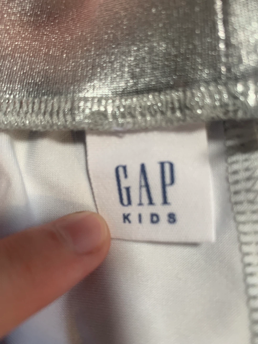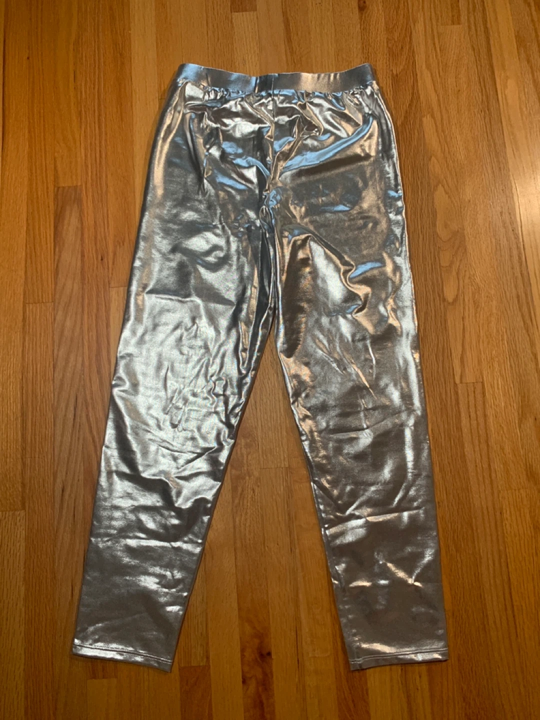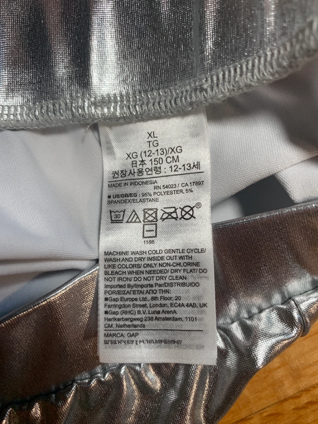 Here are some GAP Kids silver pants! They are a size XL (12). The material is 95% polyester and 5% spandex/elastane, it’s also surprising comfortable