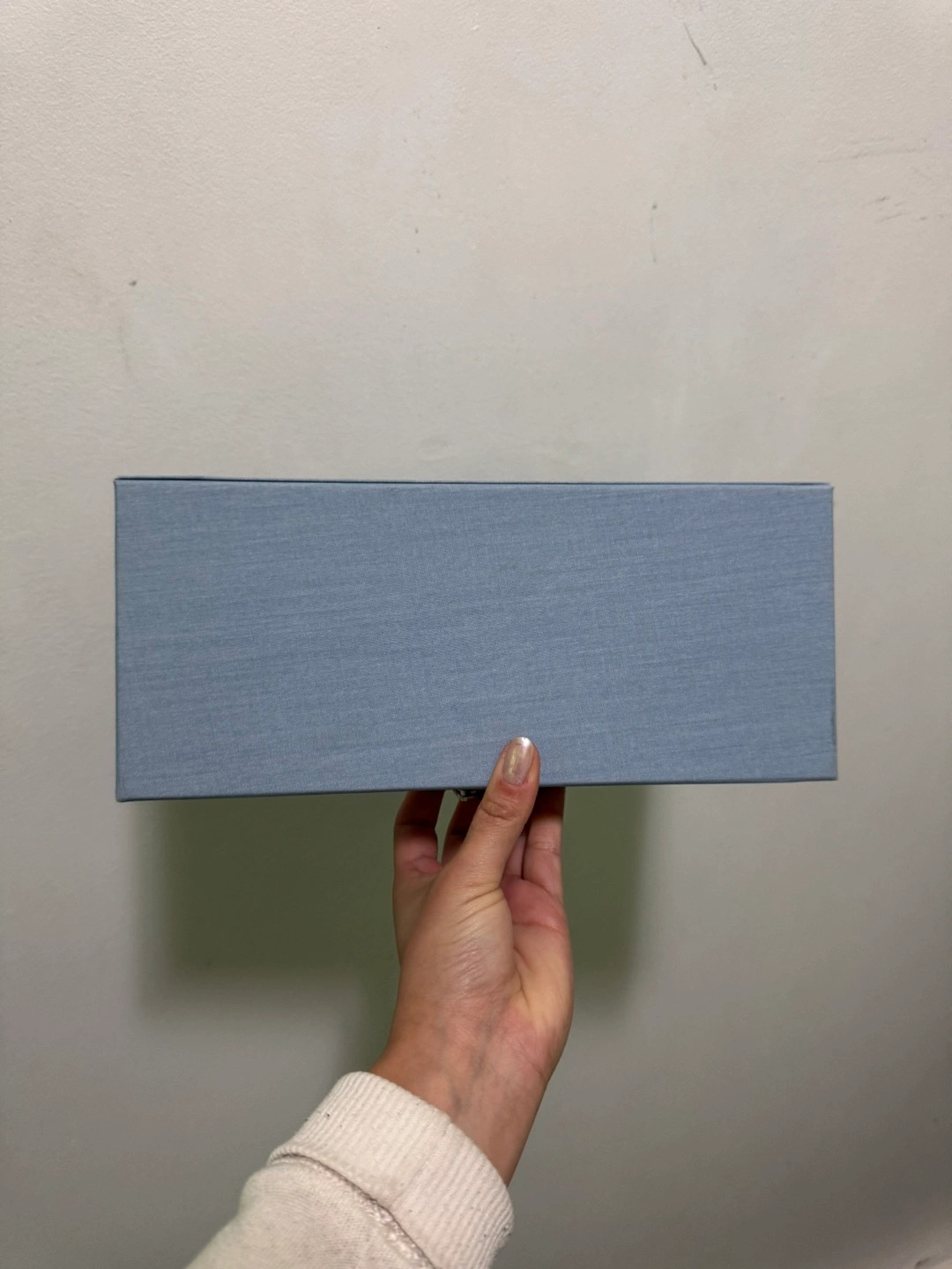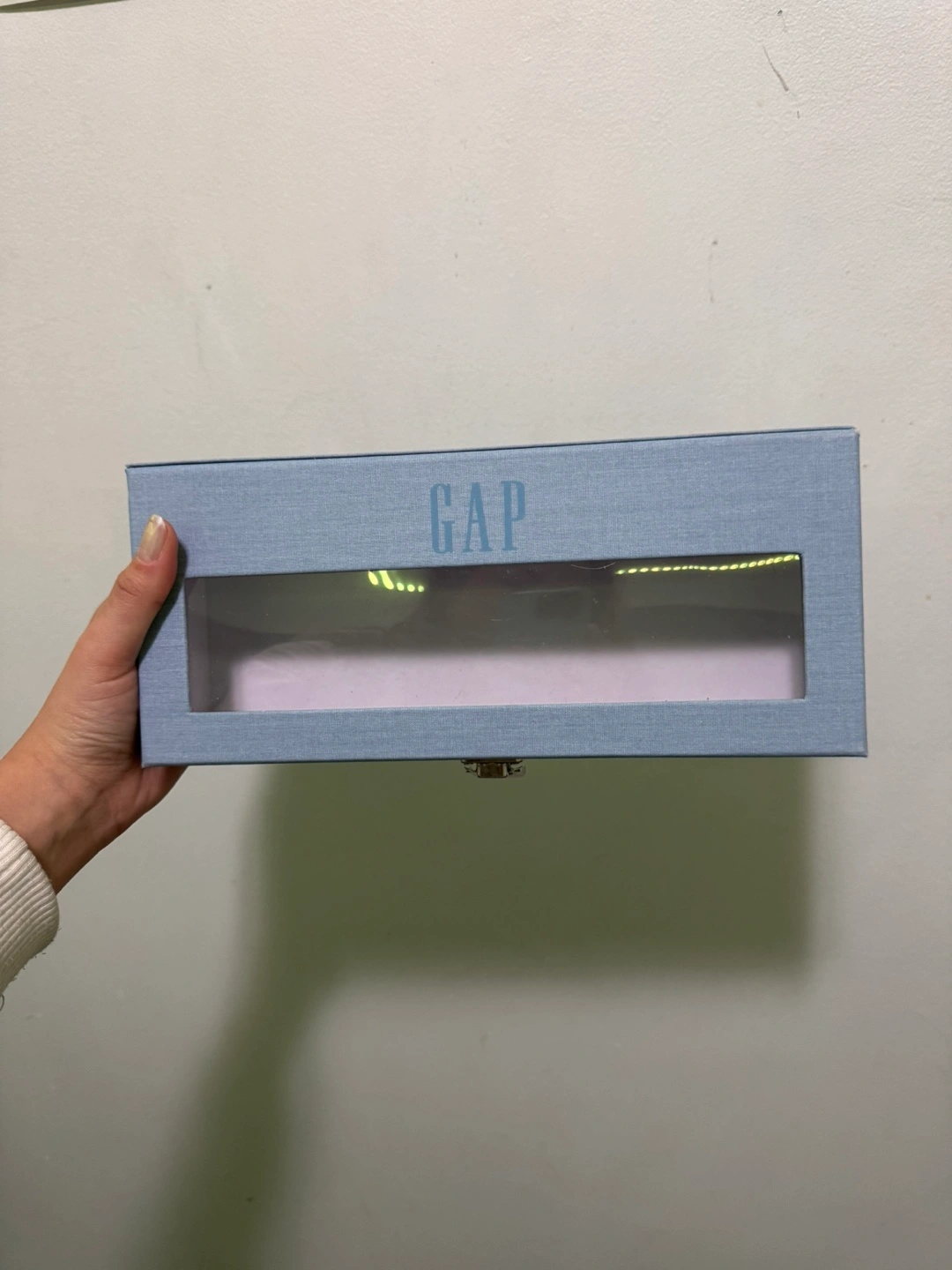 1000+Empty light blue storage box. Features a clear plastic viewing window on the lid. Metal clasp closure. Perfect for organizing small items.