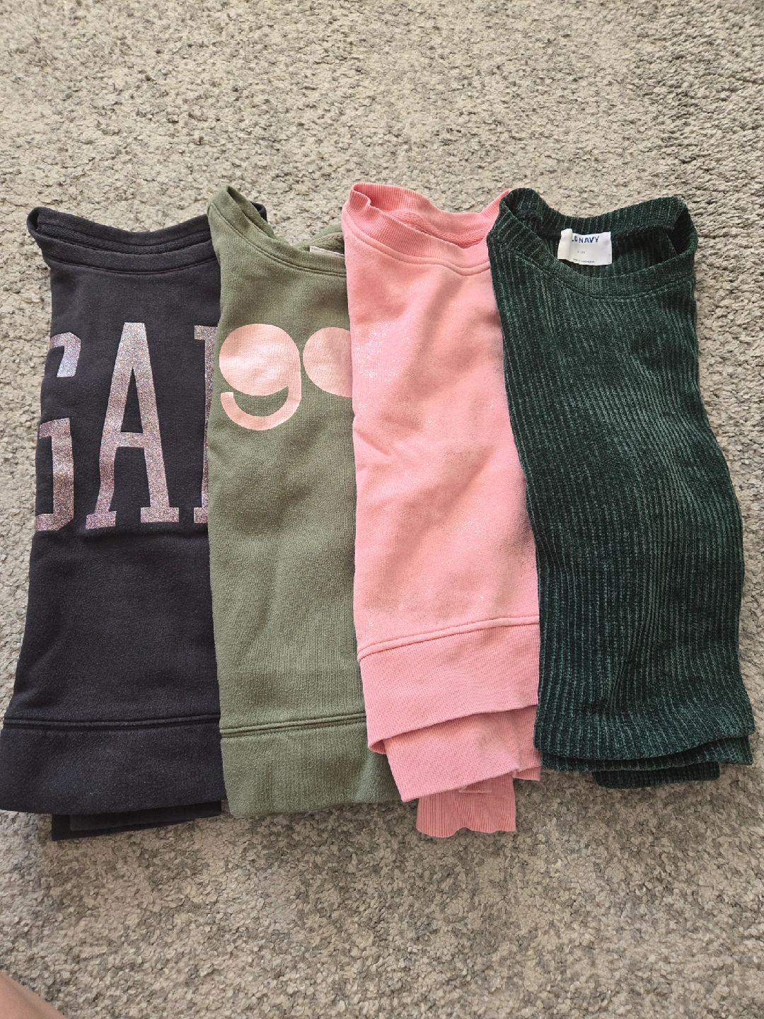 Selling a bundle of kids' sweaters. Includes: - A black Gap sweater - An olive green Gap sweater - A pink sweater - An Old Navy green sweater All in good condition!