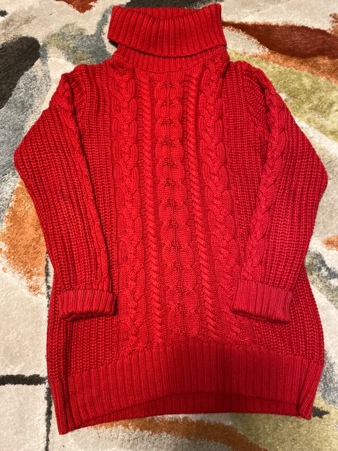 A cozy red turtleneck sweater with a classic cable knit design. Perfect for staying warm and stylish during the colder months! It's a beautiful, vibrant red colour and in great condition. The knit detailing adds a lovely texture.Great for the holidays🎄🎅