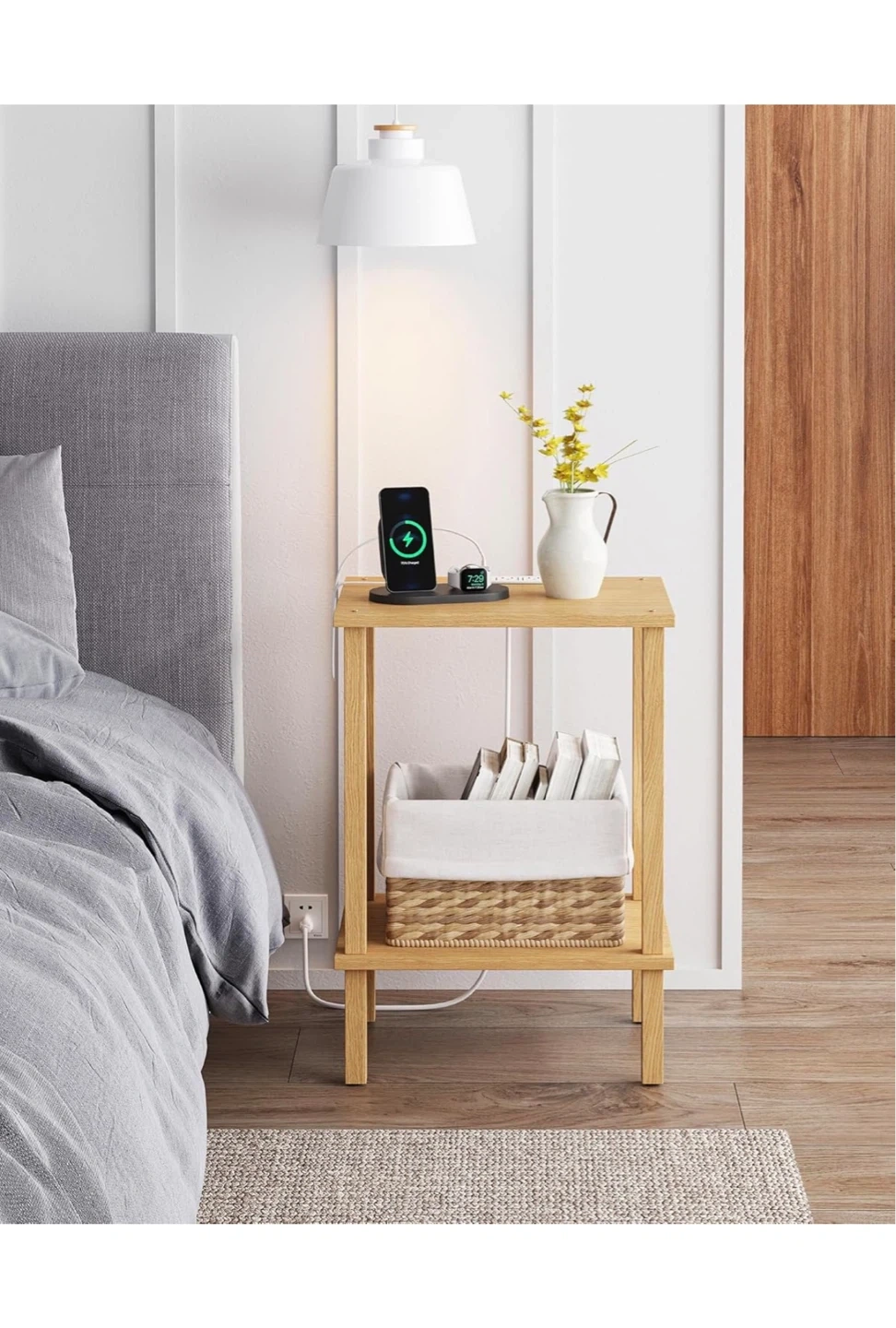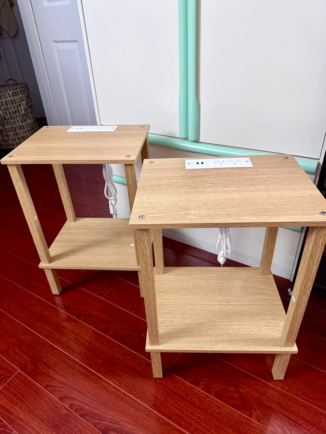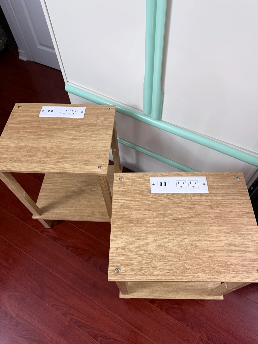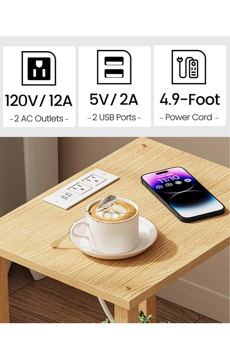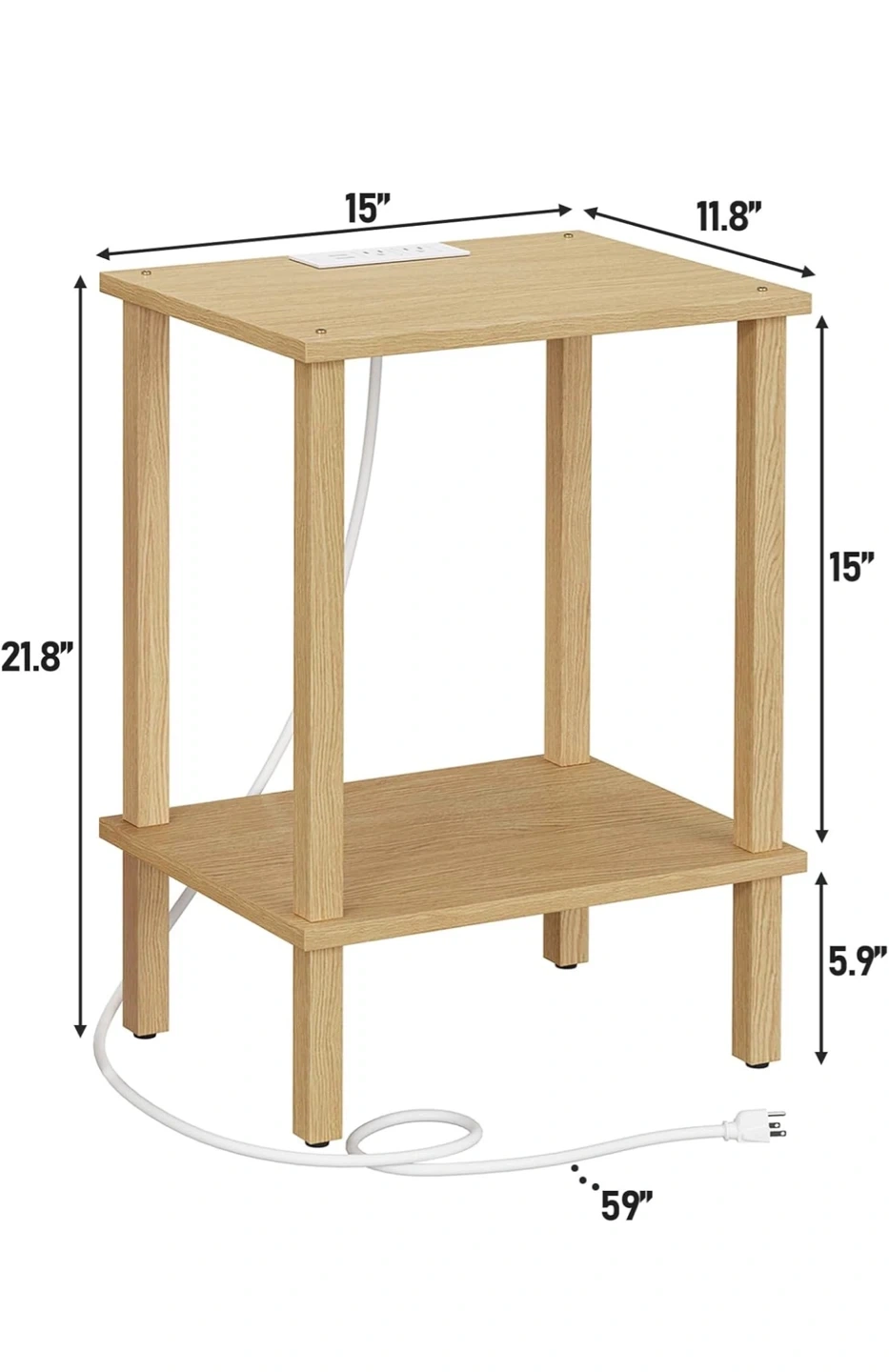 These end tables feature a natural wood finish and a convenient built-in power strip with 2 AC outlets and 2 USB ports. The power cord is 4.9-feet long. Perfect for keeping your devices charged and close by!
