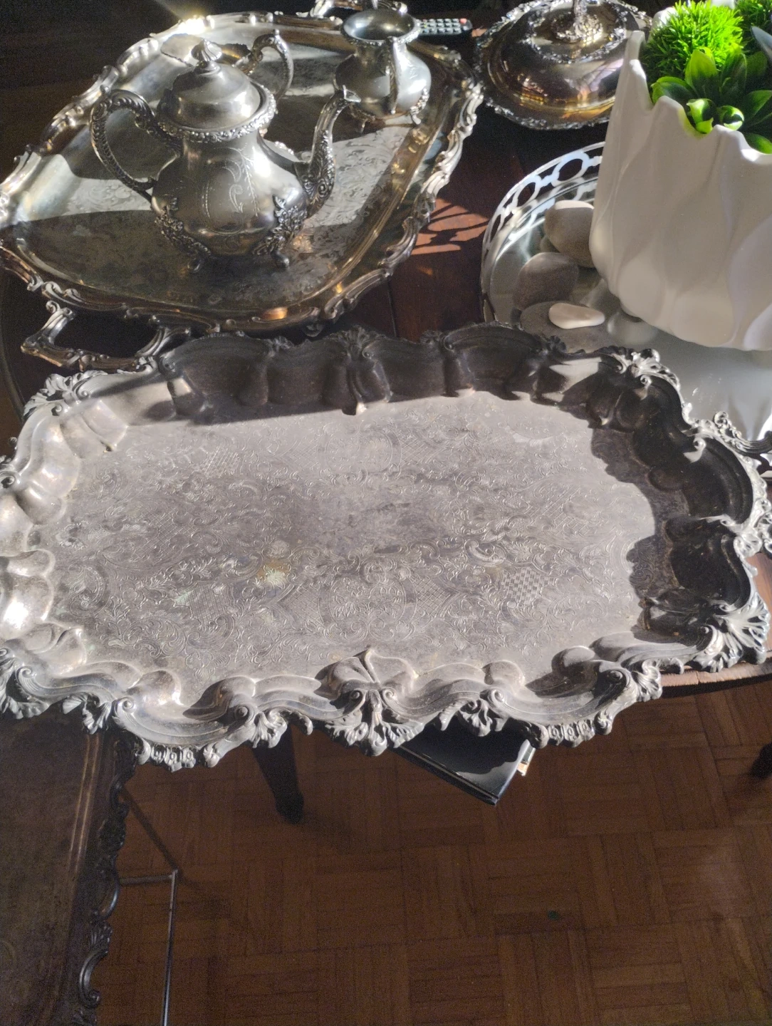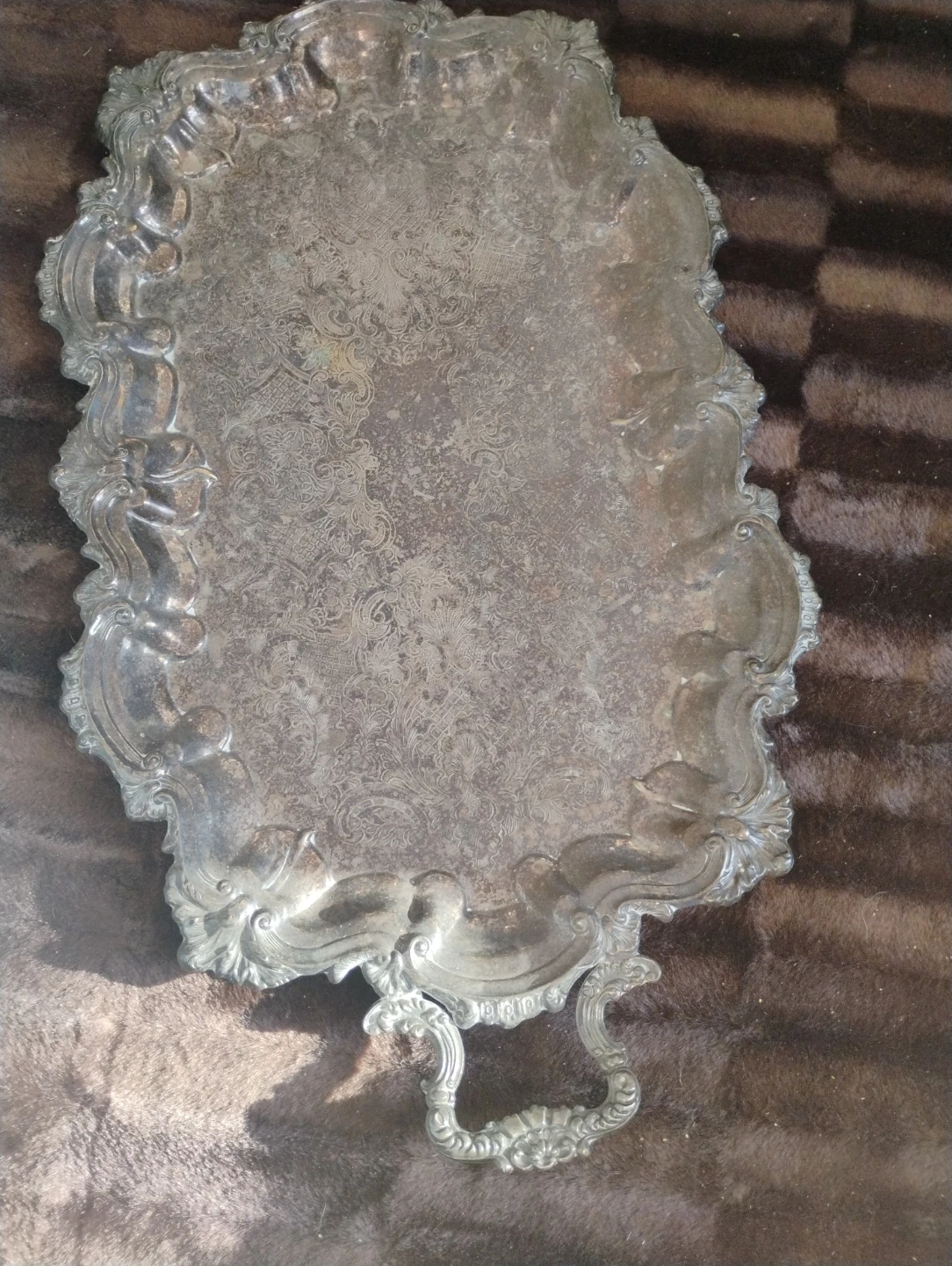 This is an ornate silver-plated serving tray with decorative handles. It's ideal for serving guests at special occasions or for displaying decorative items. Its detailed design adds a touch of elegance to any table setting.