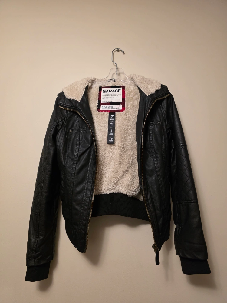 Selling a Garage Classic Bomber jacket in size XS. It's black with a cozy, soft lining. Perfect for staying warm and stylish during cooler weather!
