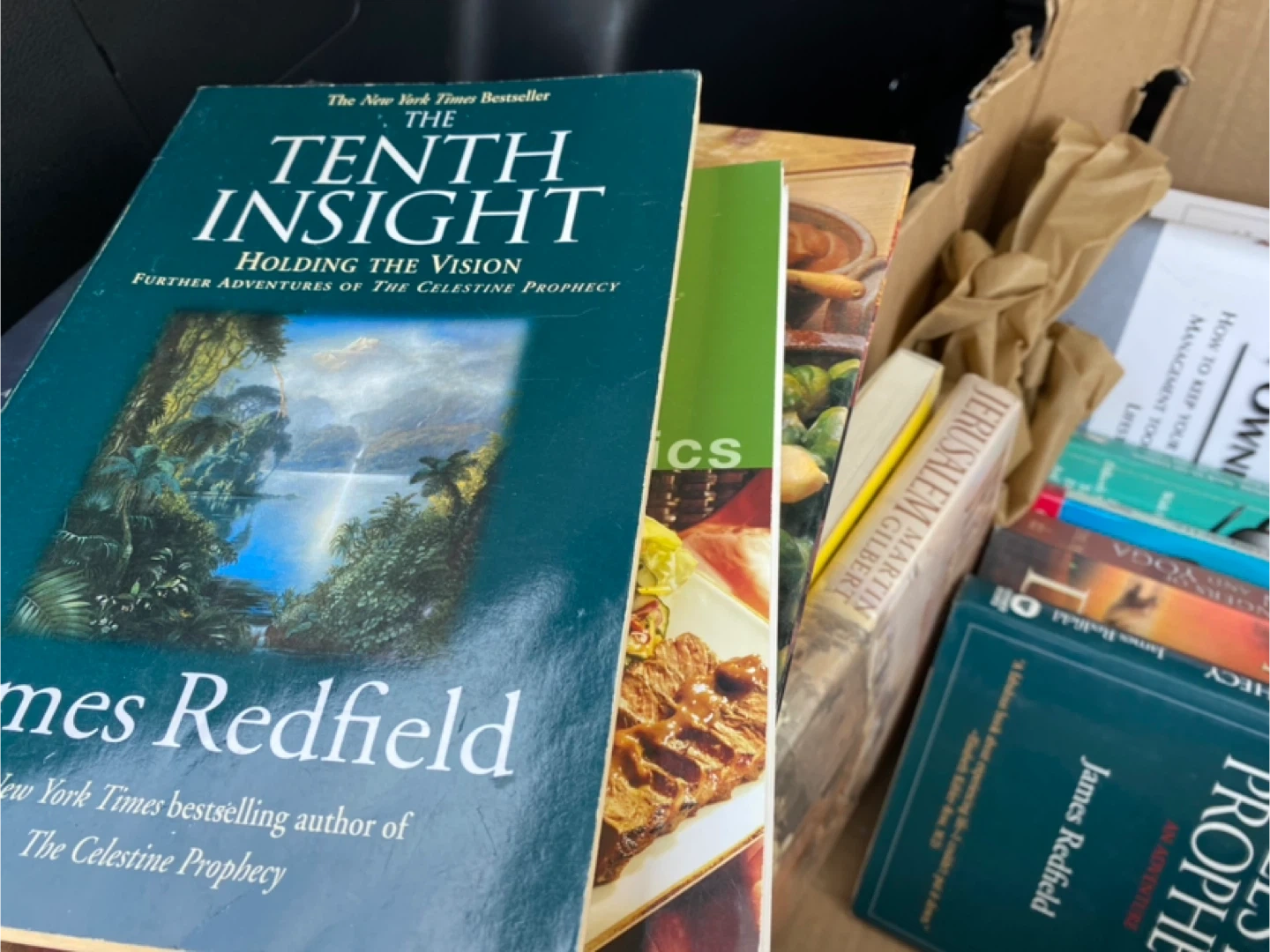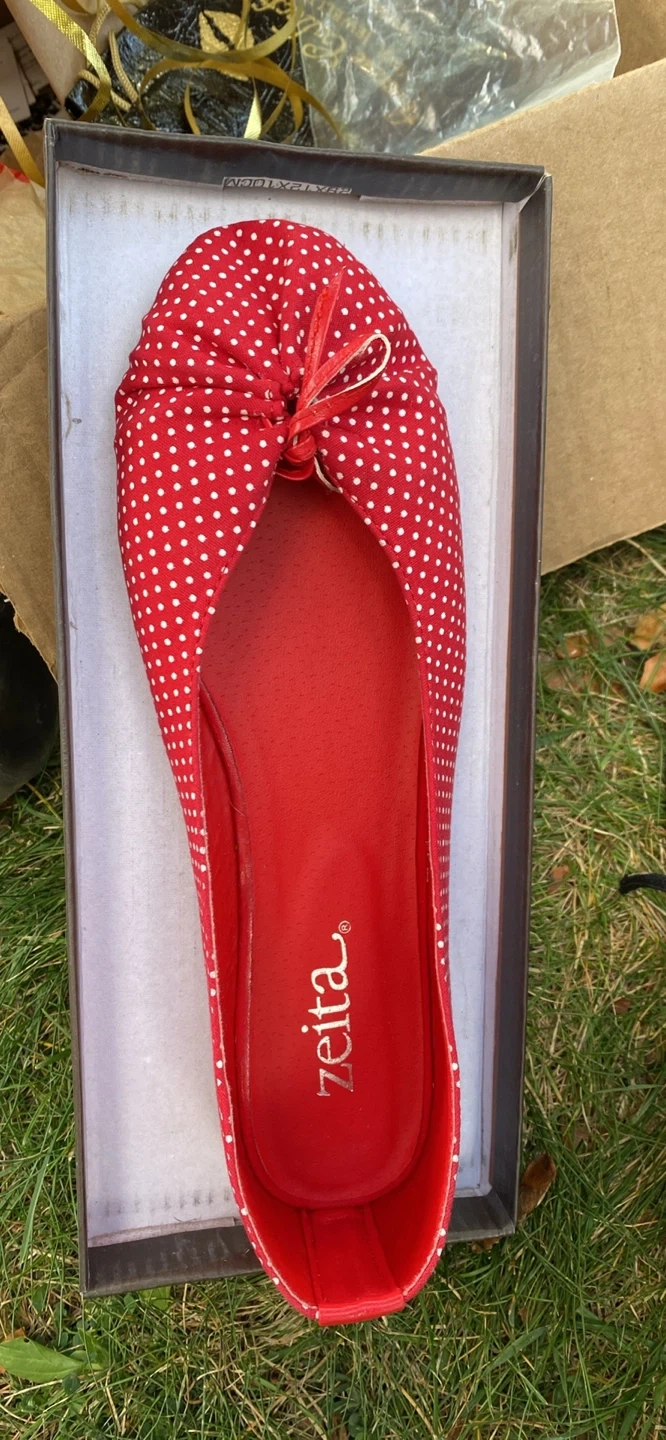 Selling a mixed lot of items including books, a pair of red polka dot shoes (brand: Zeita), and a small white ceramic jar with a lid. Great for anyone looking for a variety of items!