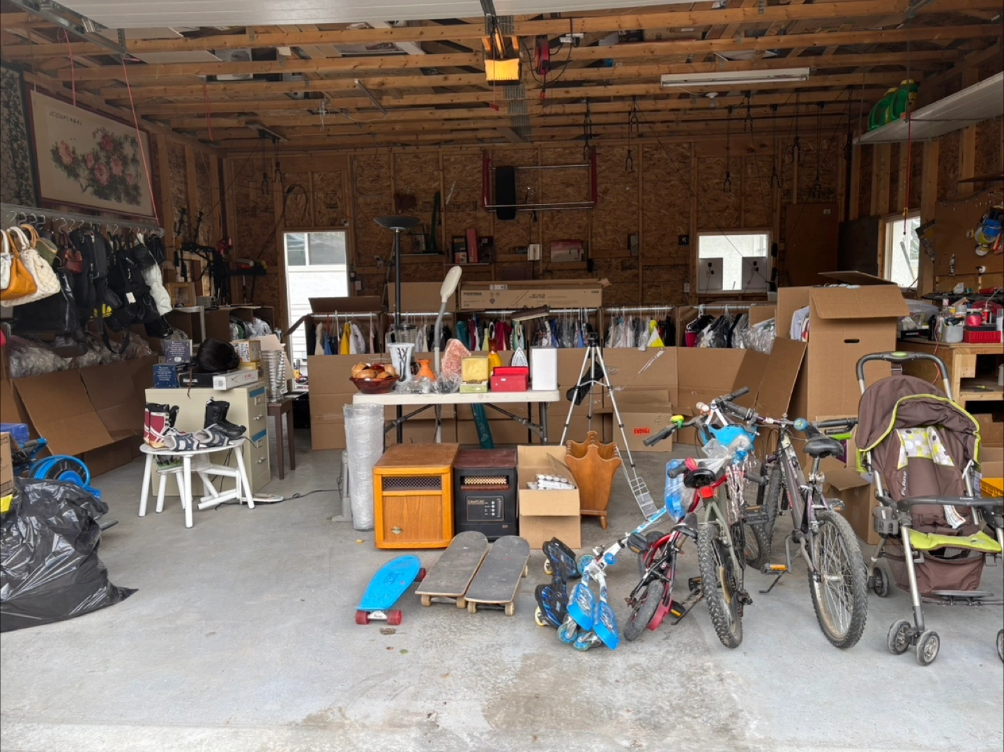 Large lot of women’s bags and women's clothing ,Includes tops, bottoms, and dresses. Various colours and fabrics. All cleaned up. Good for resale or personal use. Sold individually. July12,13 10:00AM -6:00pm