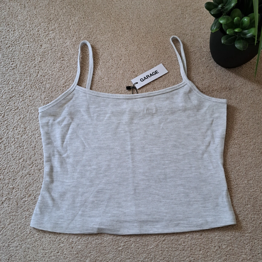 Garage Waffle Tank, new with tags attached Fixed shoulder straps Stretchy Fitted 65% modal, 30% polyester, 5% spandex Machine wash, cold Size: large Colour: light grey Approximate measurements laid flat: pit to pit: 16" Length strap to hem: 17.5"