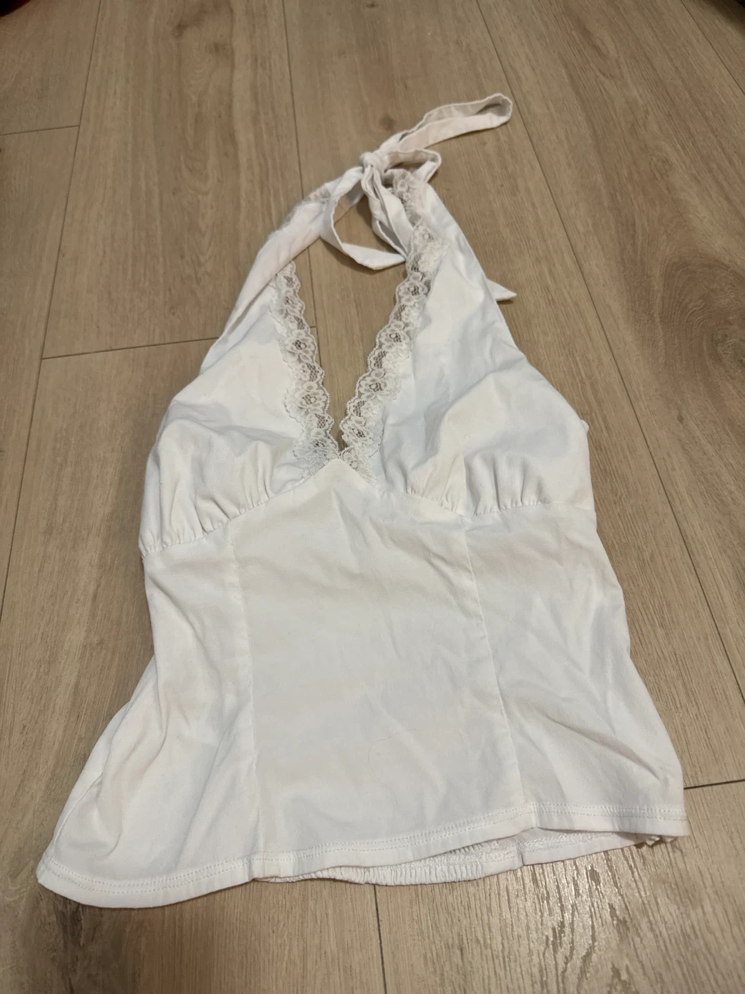 15Cute white halter top from Garage! It's a size P/S and features delicate lace detailing around the neckline. Perfect for summer!