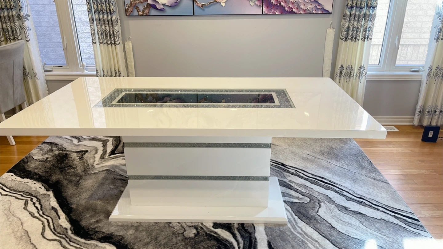 10Selling a beautiful Garbo 7-piece dining set, including the table and six chairs. This set features a glass insert and a pedestal base, adding a touch of glam to your dining area. The set is finished in white and the table width is 78.75". Originally bought for $1,634.98!
