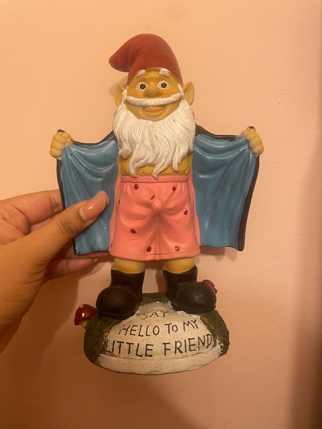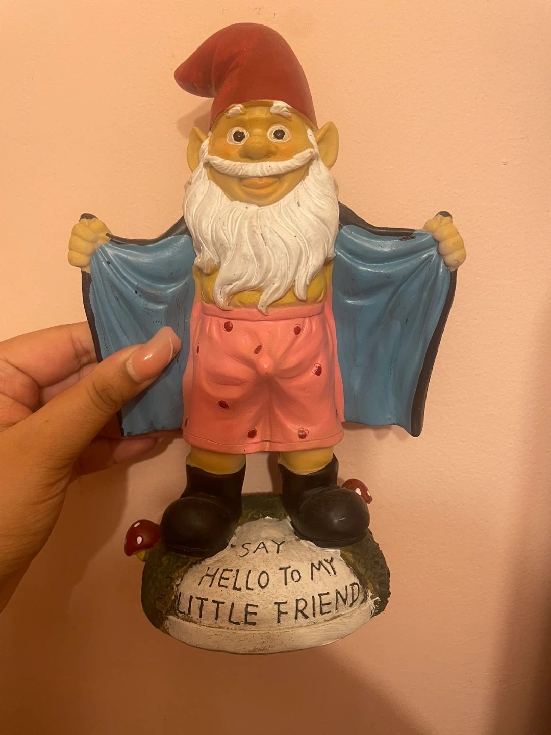 A charming garden gnome statue ready to add some whimsy to your outdoor space! This little guy is standing on a base that says "SAY HELLO TO MY LITTLE FRIEND". He's wearing a red hat, has a white beard, and is sporting some pink polka-dot shorts. Perfect for adding a touch of fun to your garden or patio