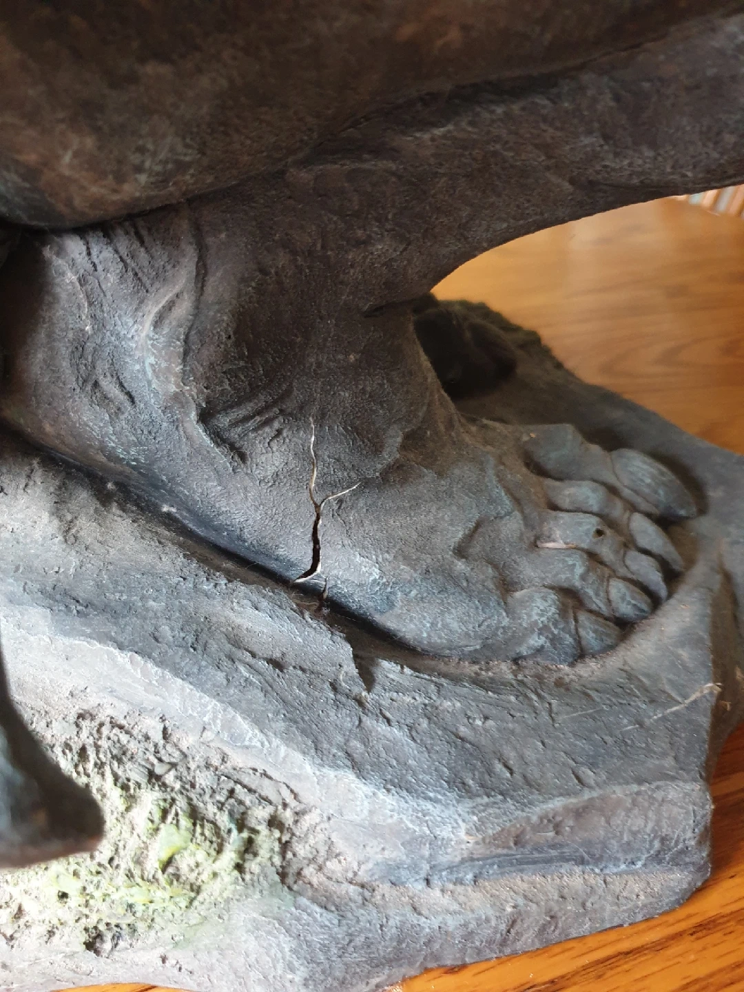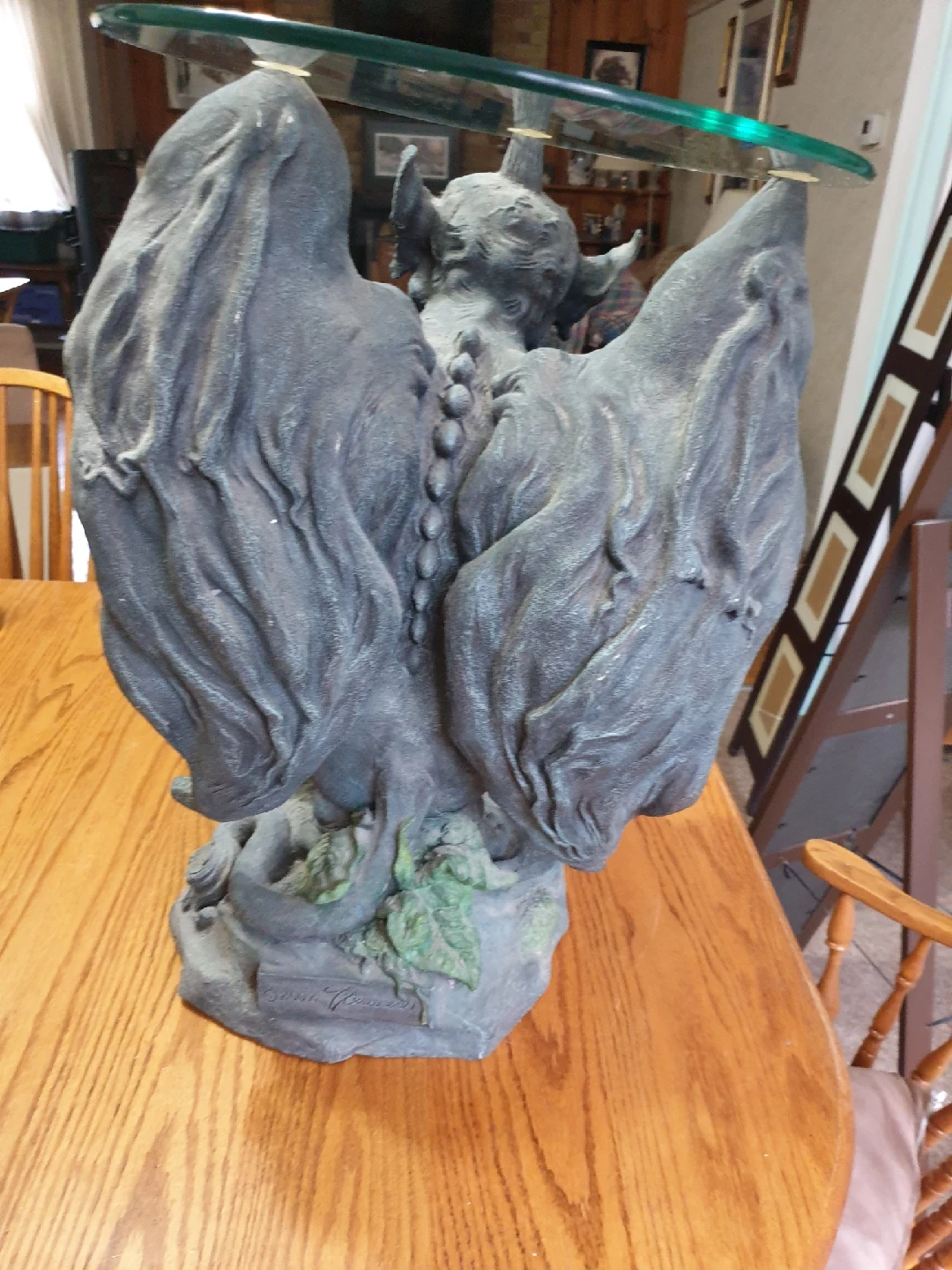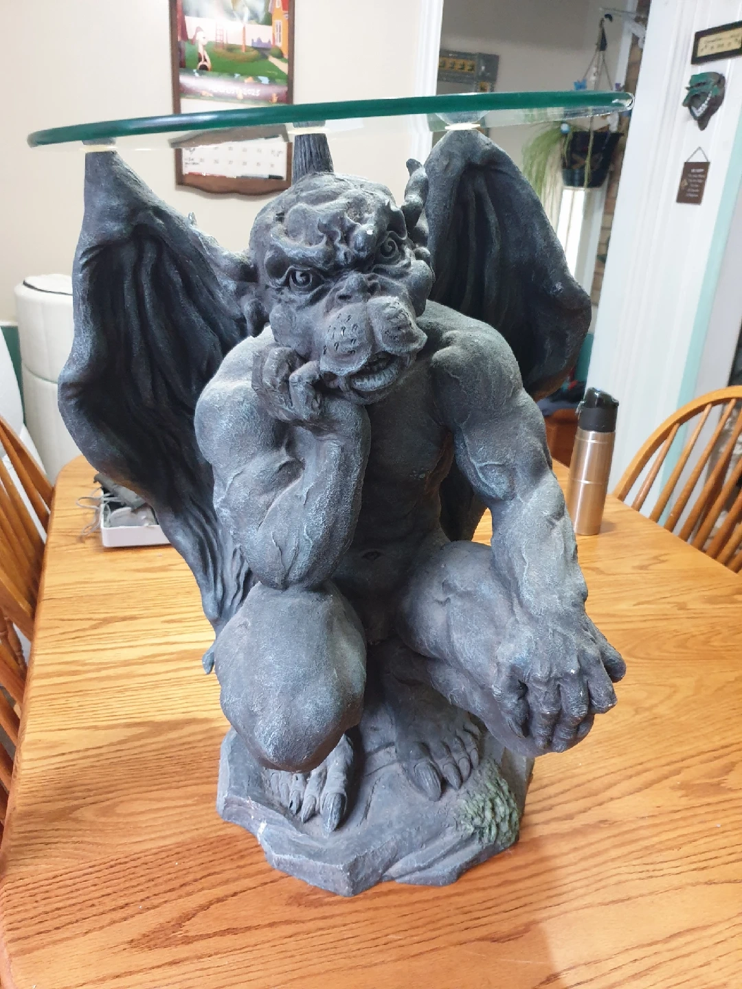 Add a touch of gothic charm to your space with this unique gargoyle glass table. The sturdy base features a detailed gargoyle sculpture in a stone-like finish, supporting a round glass top, perfect for adding character to any room. Please note that the base has a crack in the stone near the foot (see image). Table sits at an angle. I'm pricing it to reflect the crack. This quirky table is waiting for a new home, and yes, if the ad is up, it's still available! $60.00 no holds first pu
