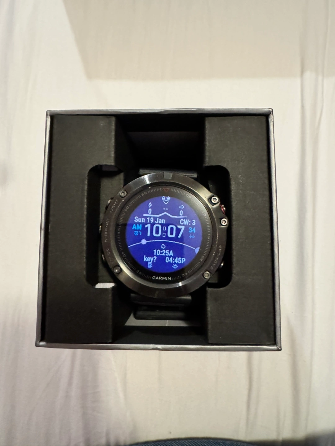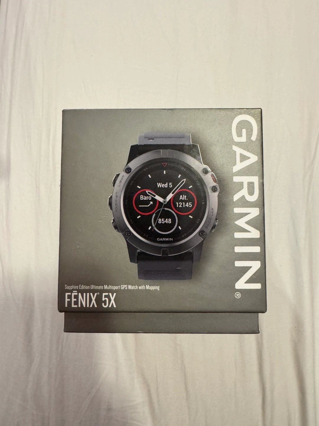 32I am selling my used Gamin Fenix 5X with sapphire display. I no longer use it as I recently switched to Apple Watch. Here are the features of this sports watch. Multisport GPS Watch with Full-color Map Guidance Ultimate multisport GPS watch with full-color TOPO U.S. mapping, routable cycling maps and other outdoor navigation features Fit for adventure with rugged design that features stainless steel bezel, buttons and rear case Built-in navigation sensors include GPS and GLONASS capability to track in more challenging environments than GPS alone as well as 3-axis compass, gyroscope and barometric altimeter Put key stats at your fingertips with the performance widget that shows your training status, training load and more Connected features² include smart notifications, automatic uploads to Garmin Connect™ online fitness community and personalization through free watch faces and apps from our Connect IQ™ store Battery life: up to 12 days in smartwatch mode (depending on settings), up to 20 hours in GPS mode or up to 35 hours in UltraTrac™ battery saver mode