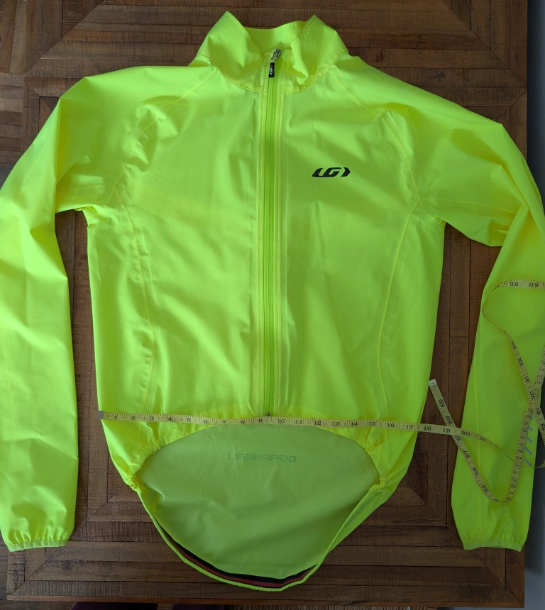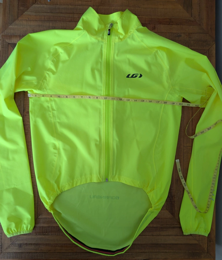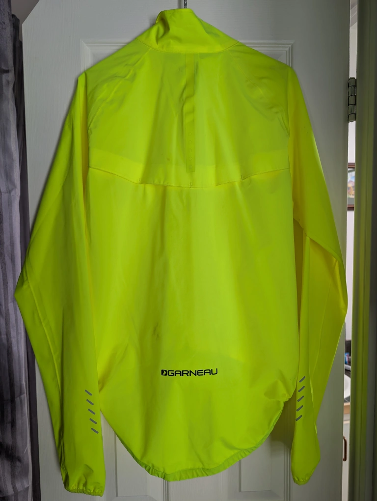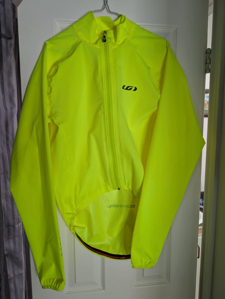 Louis Garneau lightweight cycling jacket. Size small. Bright yellow colour. Full zip. Long sleeves. Elastic waistband. Reflective details. Great for visibility. Like new. Worn outdoors once in dry conditions. Pick up in Leslieville or meet up at Gerrard Square.