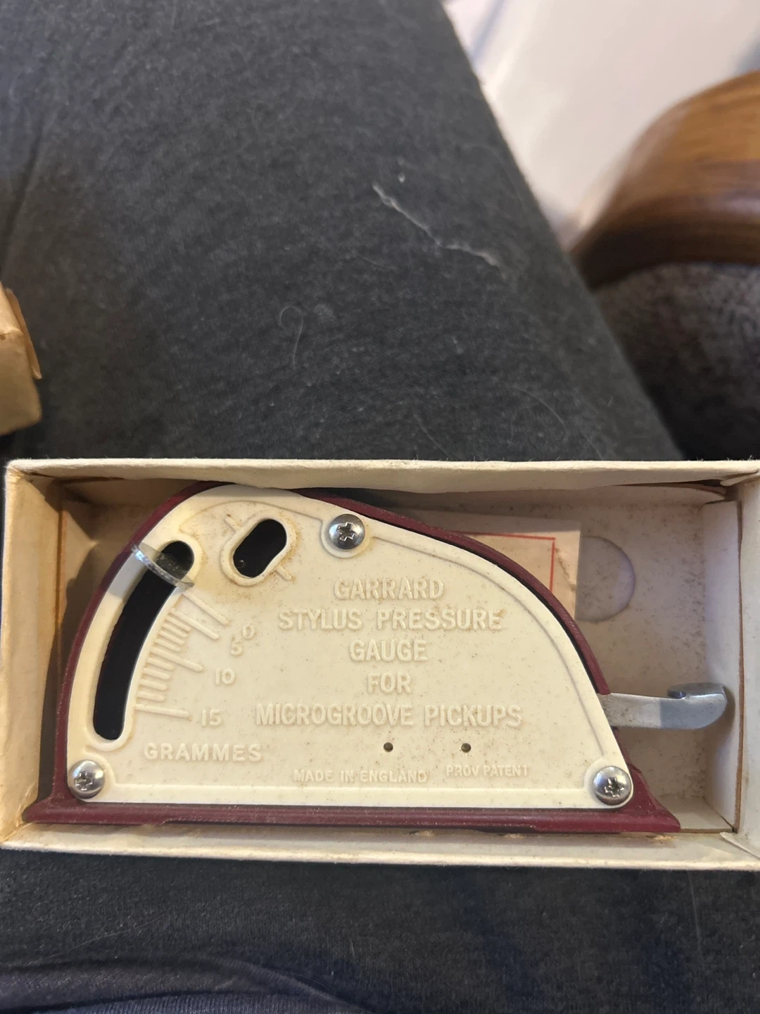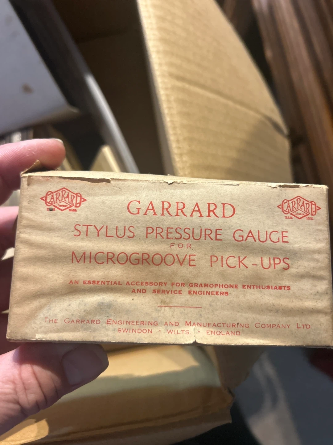 Selling a vintage Garrard stylus pressure gauge for microgroove pick-ups! This is an essential accessory for gramophone enthusiasts and service engineers. The box is included and reads: The Garrard Engineering and Manufacturing Company LTD, Swindon, Wilts, England