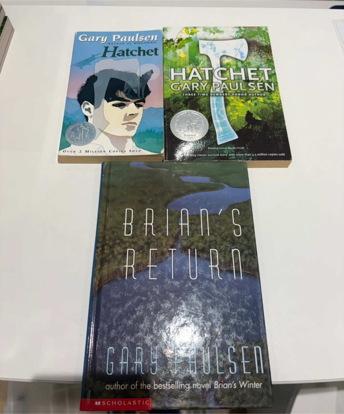 $5 each Hatchet (Book 1, 1986) • The original and most famous book in the series. • Plot: 13-year-old Brian Robeson survives a plane crash in the Canadian wilderness with only a hatchet. He learns to live off the land in a gripping survival story. • Awards: Newbery Honor Book (1987). 2. Hatchet (a second copy, with a different cover design) • You have two editions of the same book, one with older cover art and one more modern. 3. Brian’s Return (Book 4, 1999) • Brian, now older, finds he cannot readjust to regular city life after his wilderness survival experiences. He returns to the wild to find peace. • This is a direct continuation after Hatchet, The River, and Brian’s Winter.