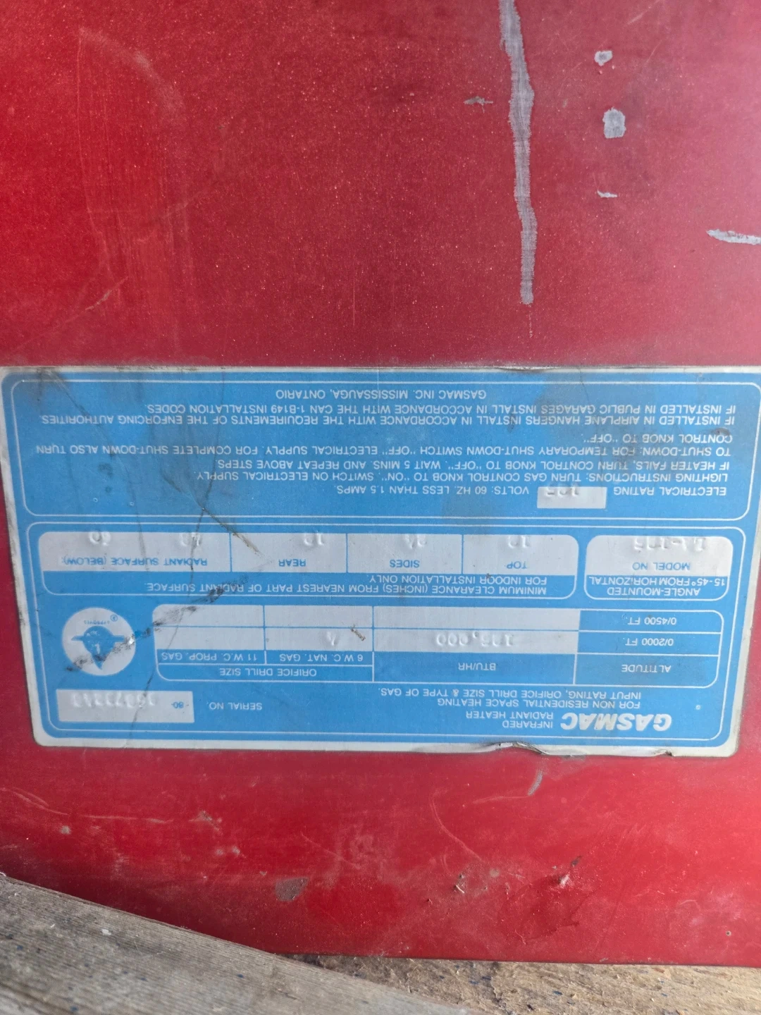 10Selling a Gasmac infrared heater. It's designed for non-residential space heating. It requires a 120 volts electrical supply and consumes less than 1.5 amps. It also needs either natural gas or propane gas for operation. It's designed for indoor installation only