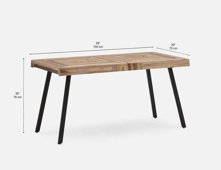 Beautiful dining table with a unique patterned wood top and black metal legs. Great for your dining room or kitchen. Dimensions are 59 inches long, 30 inches wide, and 30 inches high. Chairs sold separately.