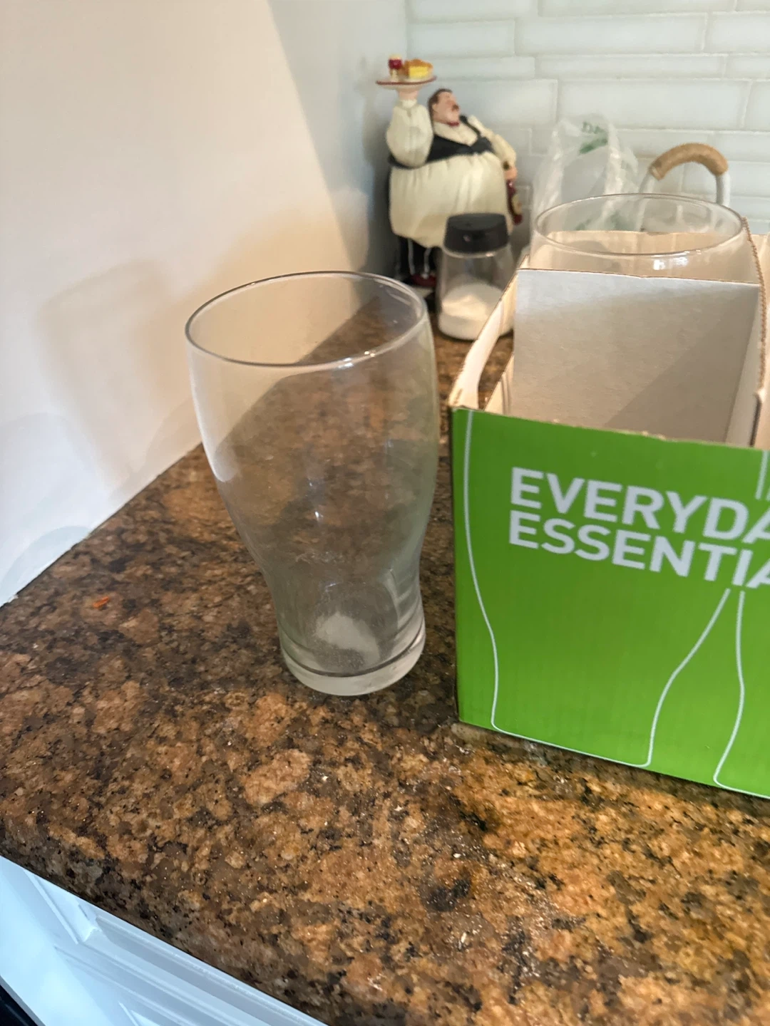 This is a set of six drinking glasses from Everyday Essentials. They're made of clear glass and come in their original packaging. These glasses are suitable for everyday use.