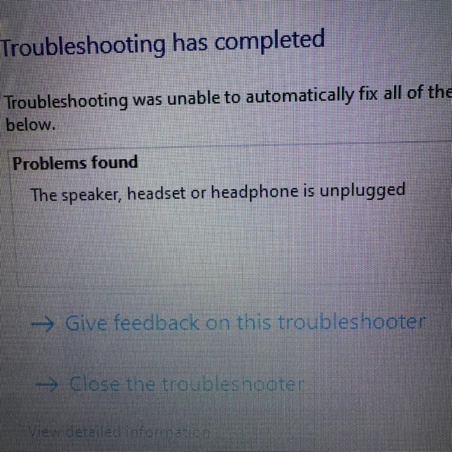 Audio troubleshooting shows that the speaker/headphone may need to be connected or checked.