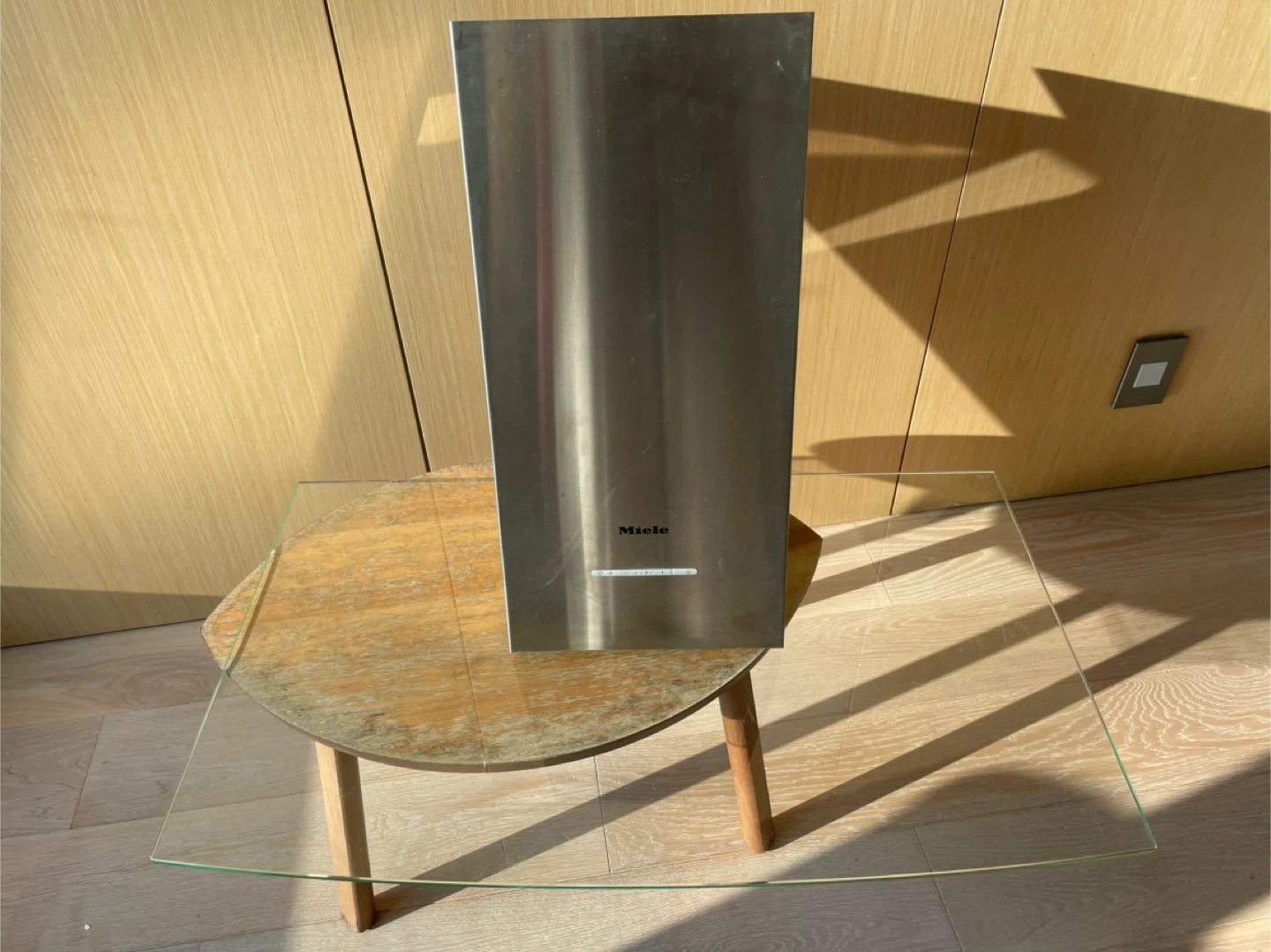 Miele glass and stainless steel range hood. Never used. 625 CFM motor. Grease filters are dishwasher-safe. Minor scratches on glass.