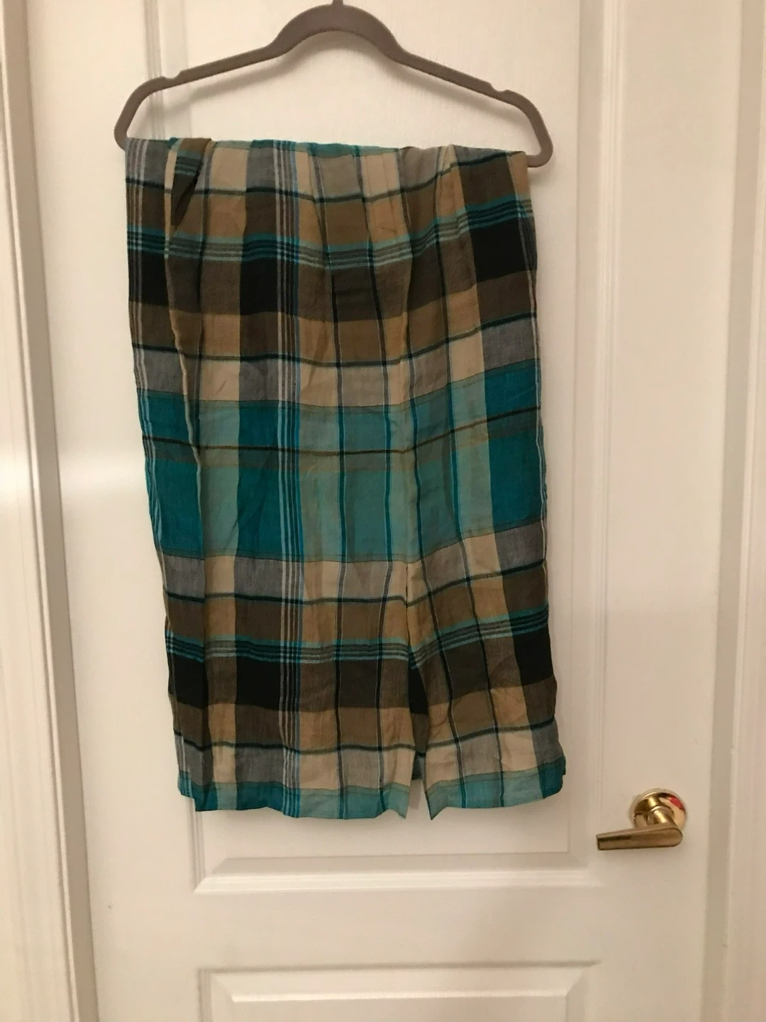 A blue, tan, and brown plaid pleated midi skirt. Features belt loops and zipper closure detail at the waist with a slit in the middle . Perfect for casual wear in 3 seasons.fits size XS . Material is partly linen and it is European made. Great condition.