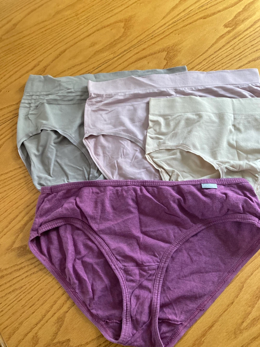 Four pairs of women's brief-style underwear in various muted colours. Three are new but out of package (wrong size for me), and one cotton Jockey brief. Fits L.