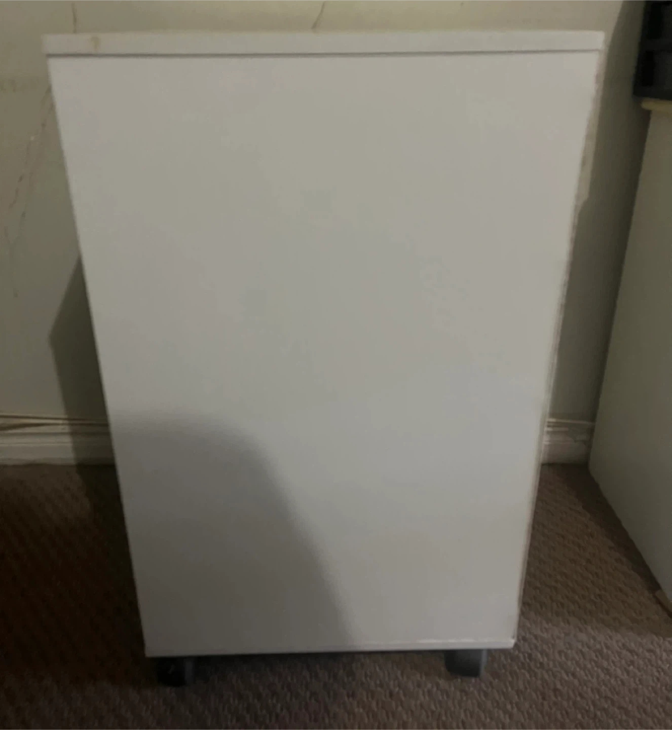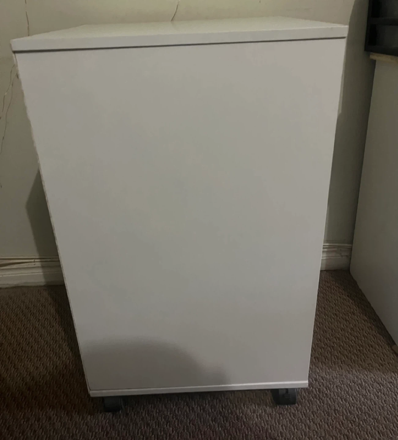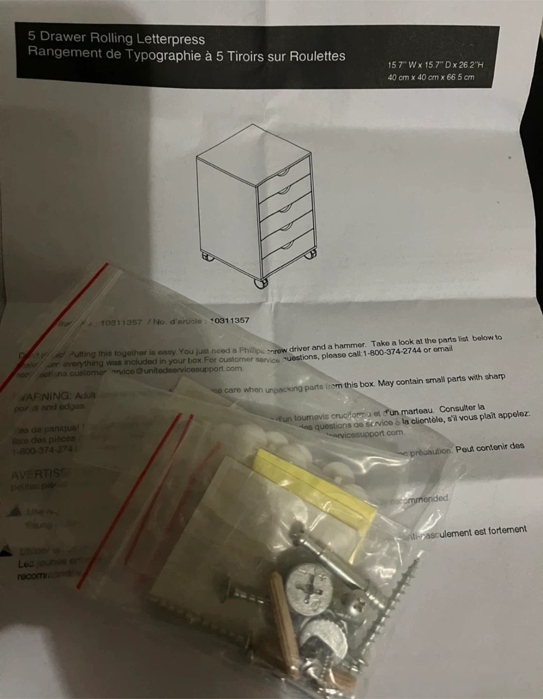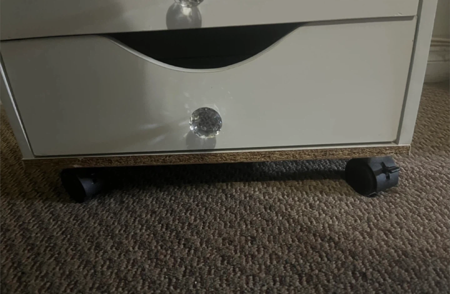 White rolling storage cart with five drawers. Each drawer has a clear crystal-look knob. It's on wheels for easy movement. Come with extra parts as seen in last photo